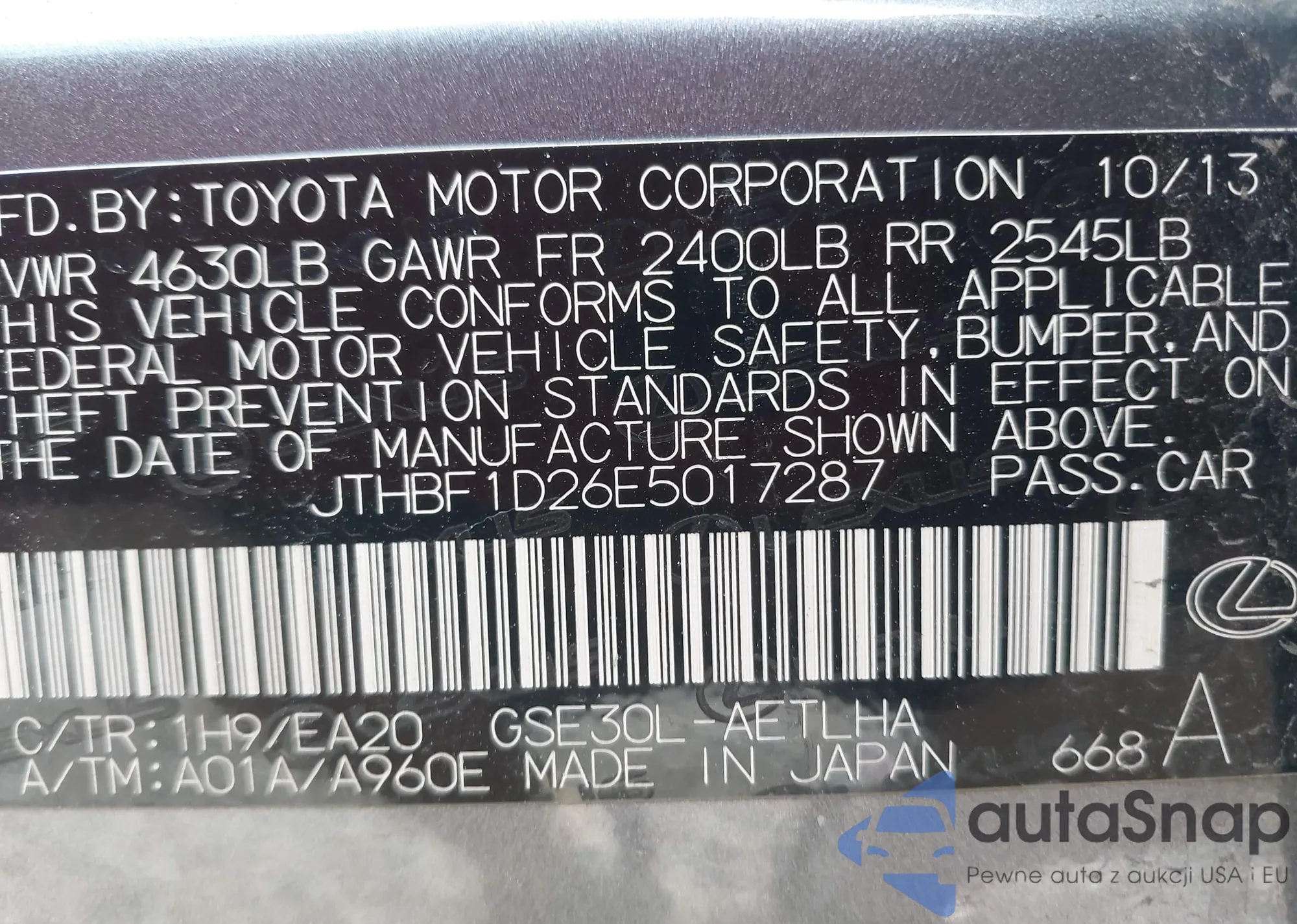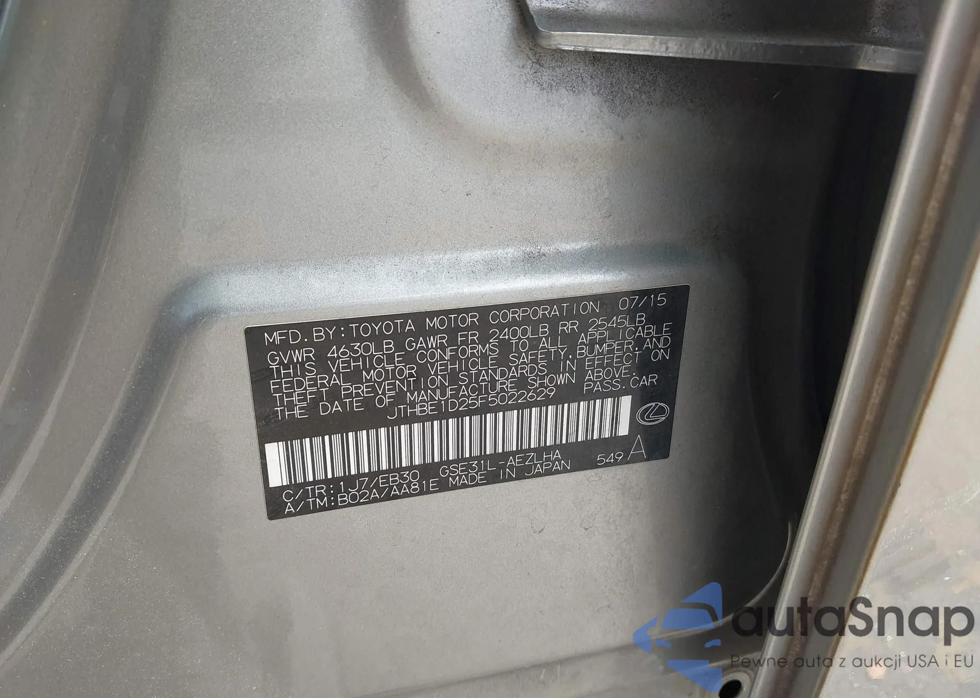 LOT: 44294036 VIN: JTHBE1D25F5022629