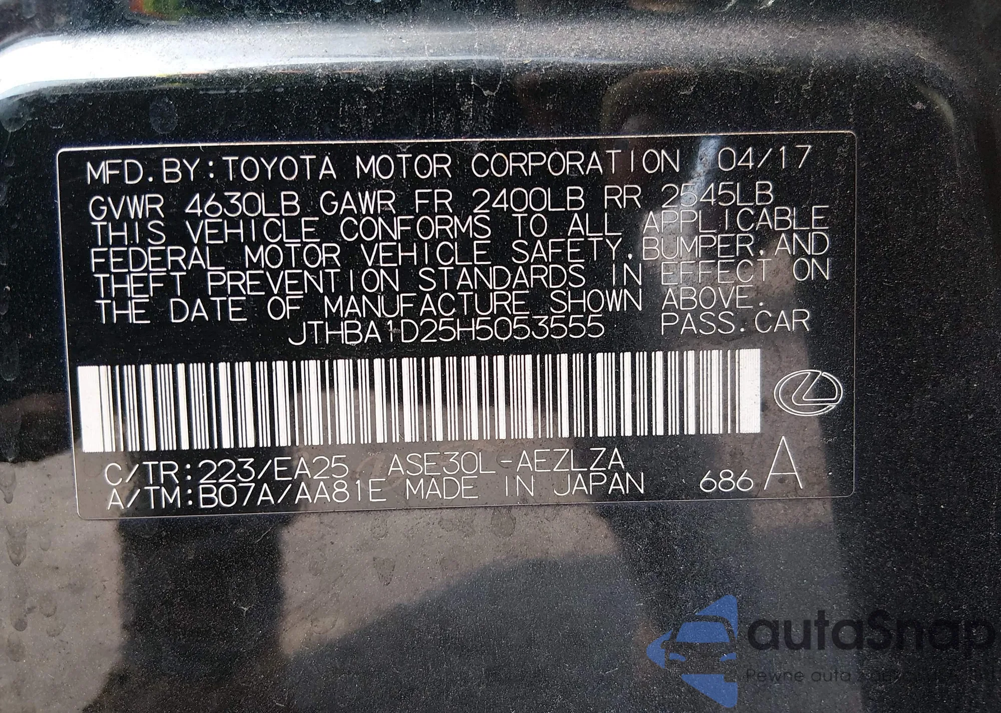 LOT: 44354876 VIN: JTHBA1D25H5053555