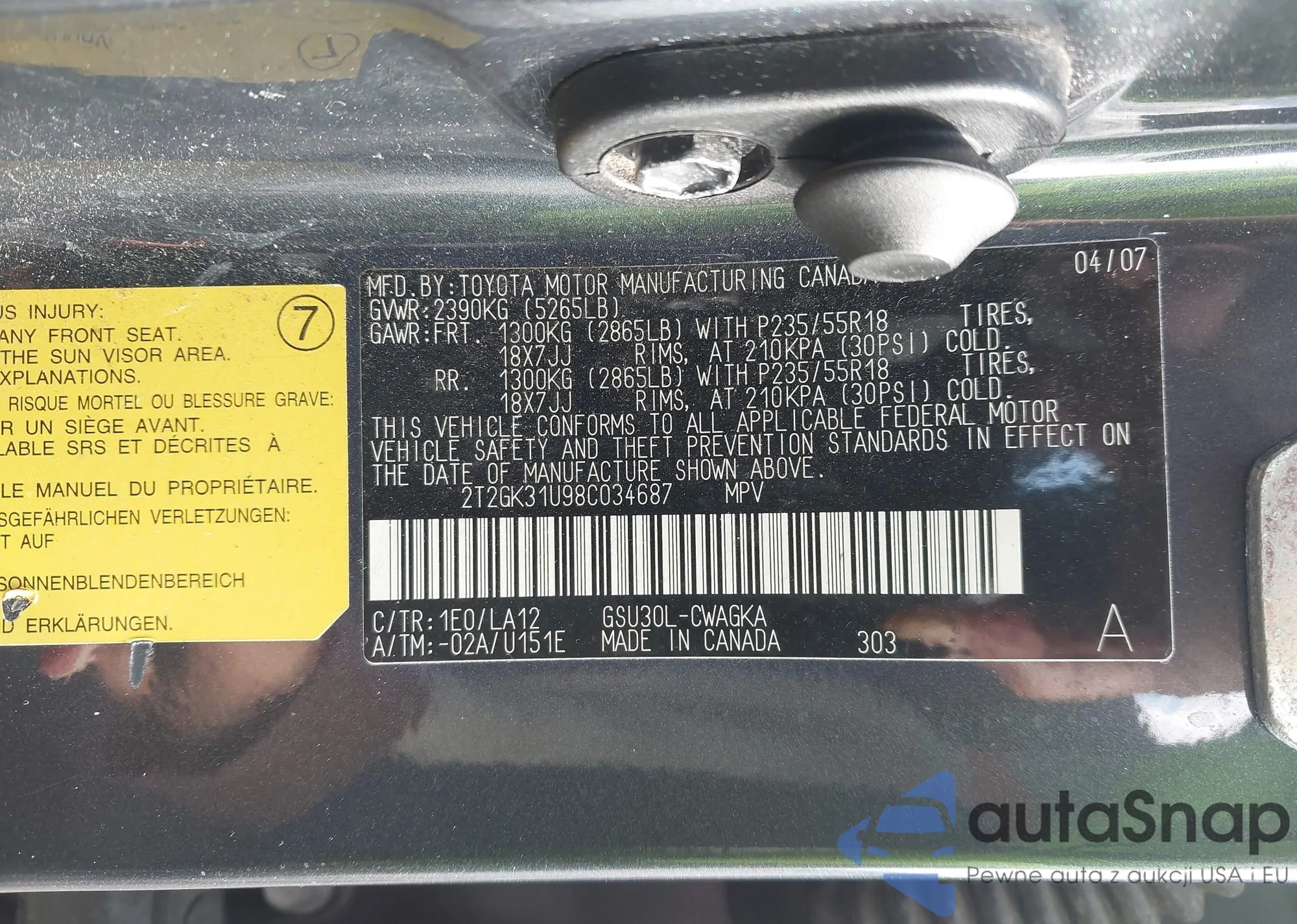 LOT: 44447845 VIN: 2T2GK31U98C034687