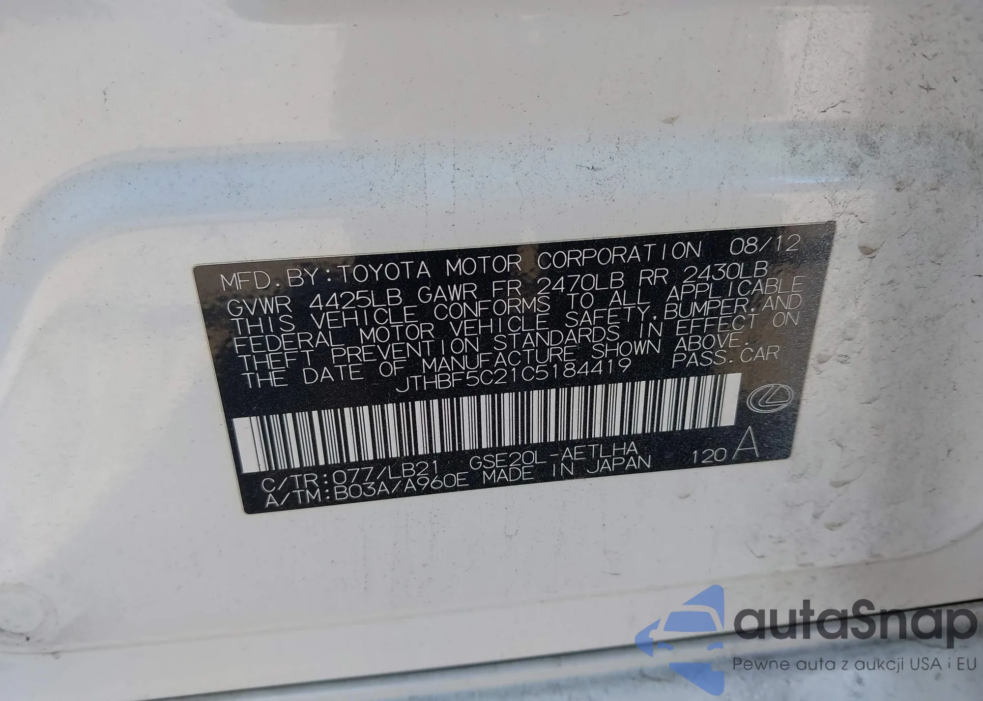 LOT: 44453252 VIN: JTHBF5C21C5184419