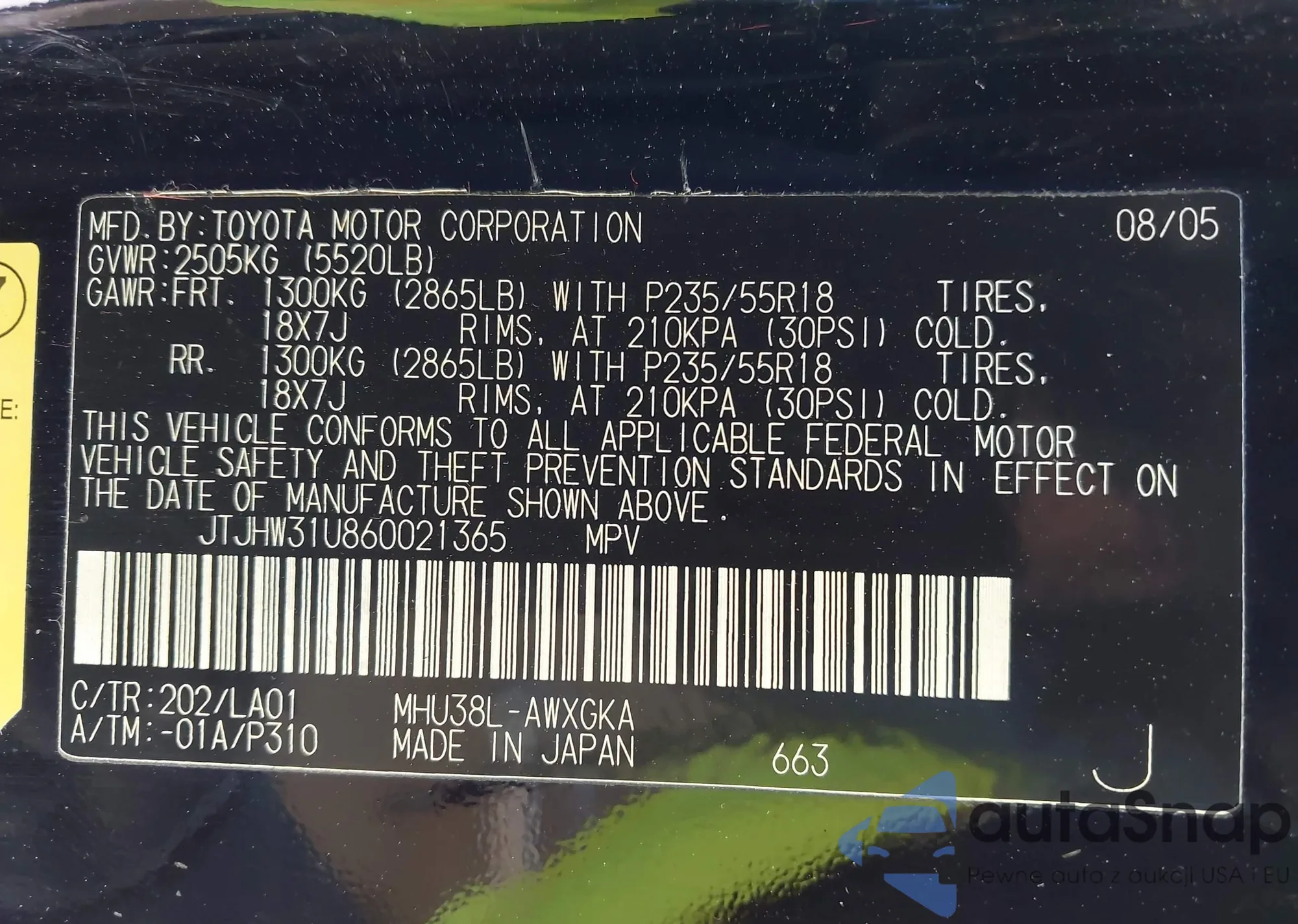 LOT: 44427033 VIN: JTJHW31U860021365