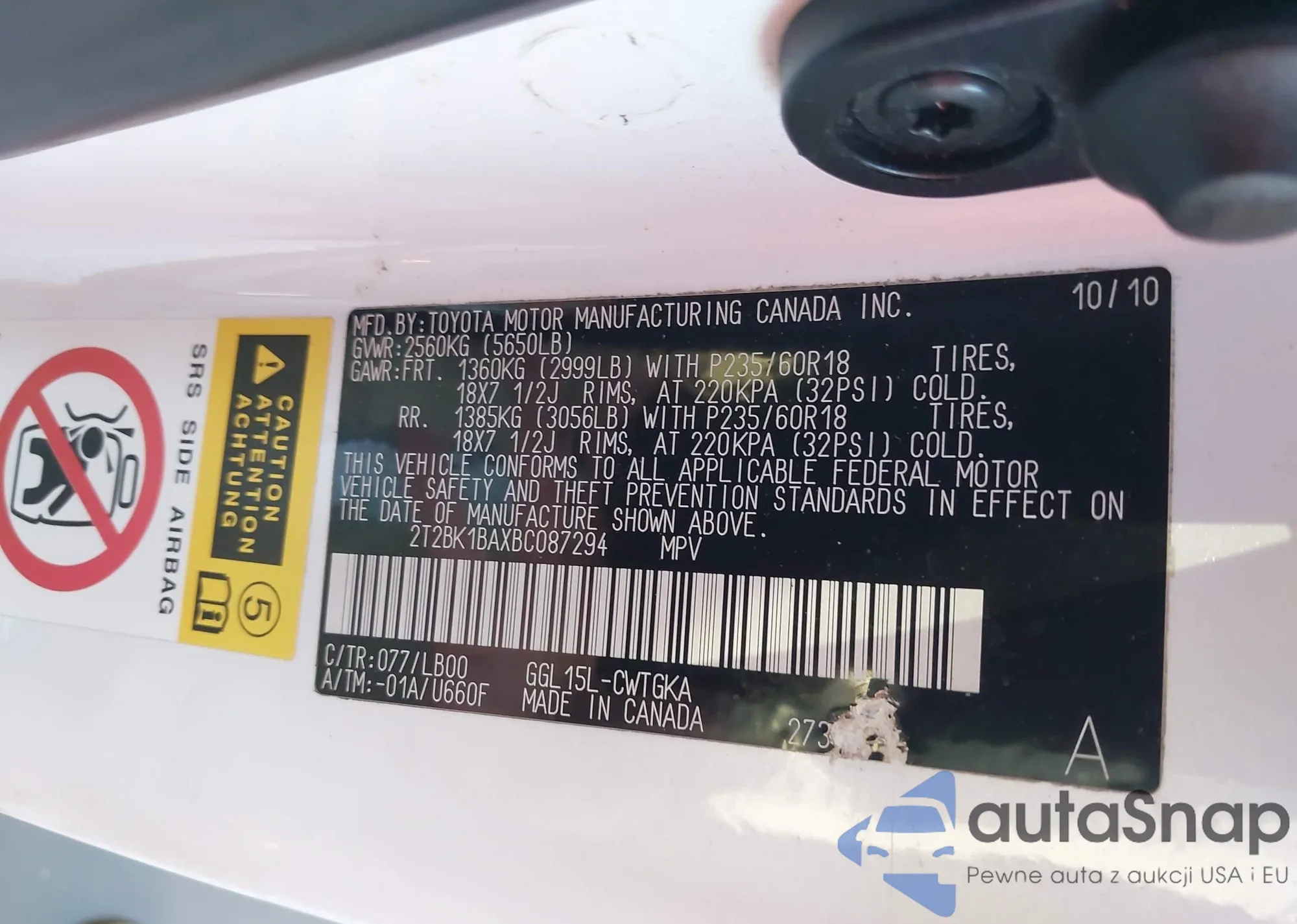 • VIN 2T2BK1BAXBC087294