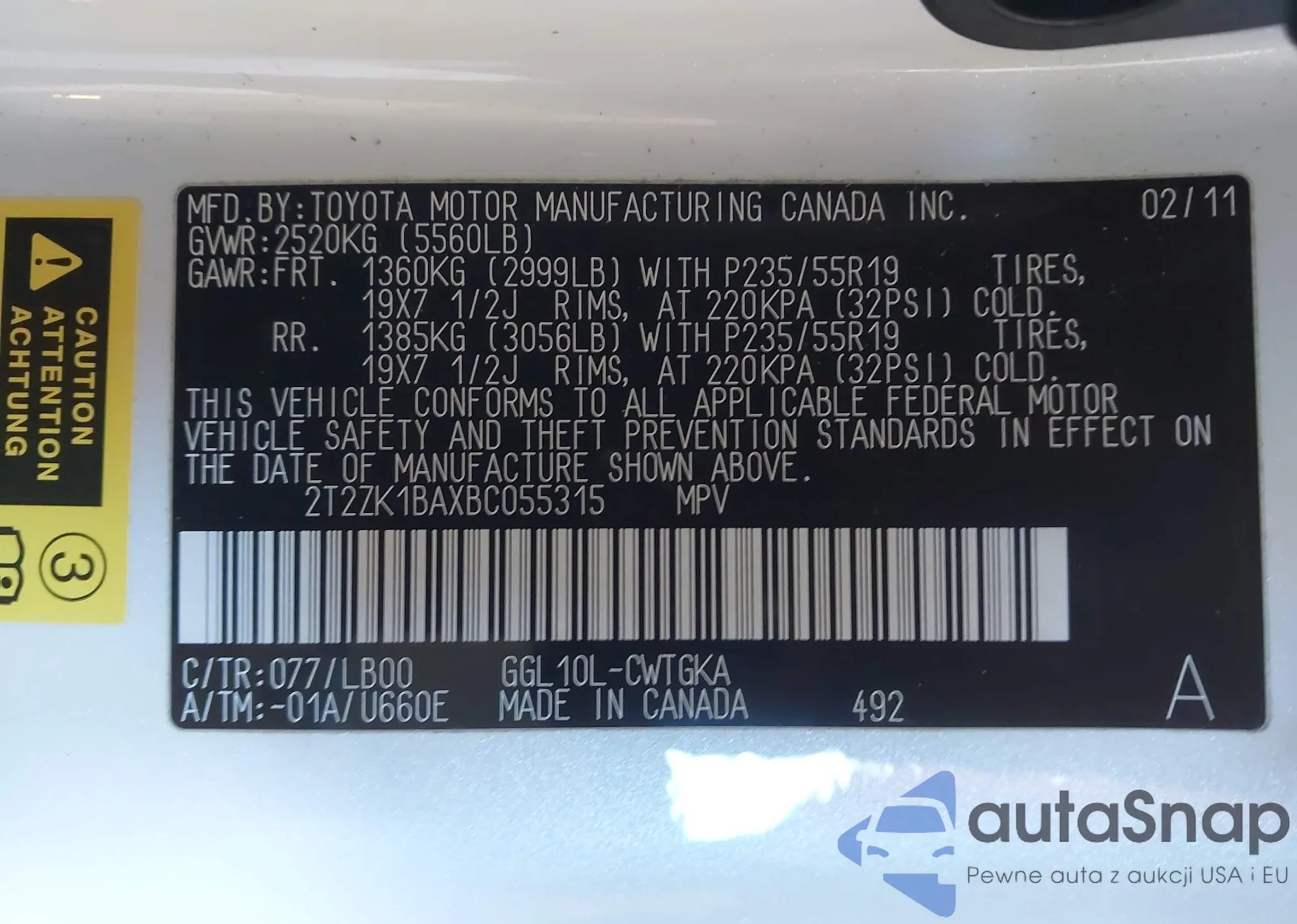 • VIN 2T2ZK1BAXBC055315