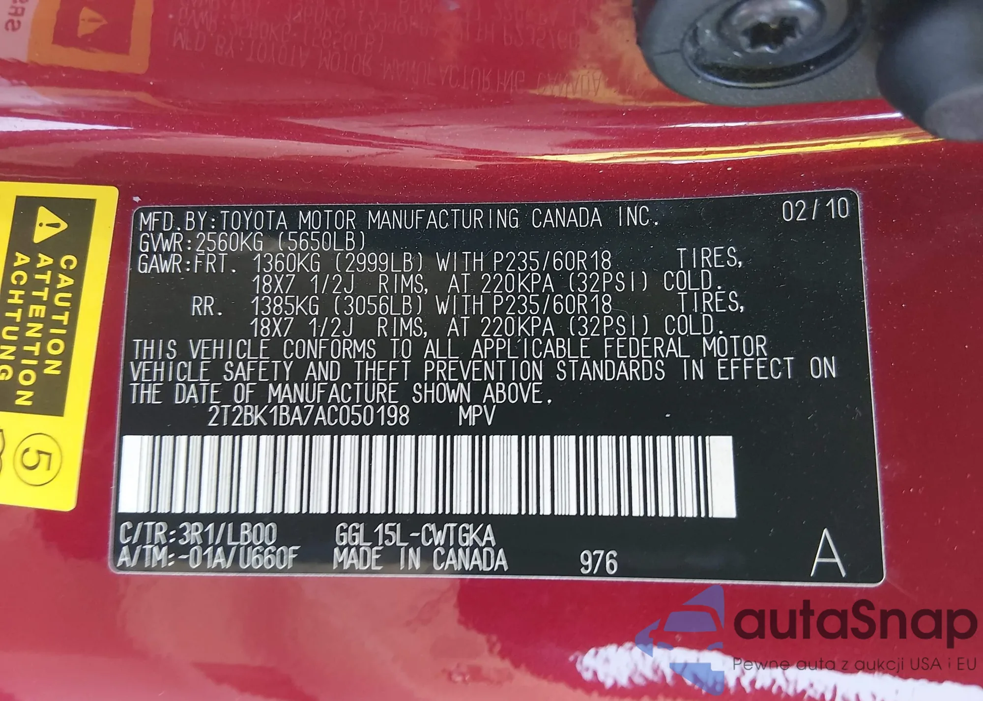 • VIN 2T2BK1BA7AC050198