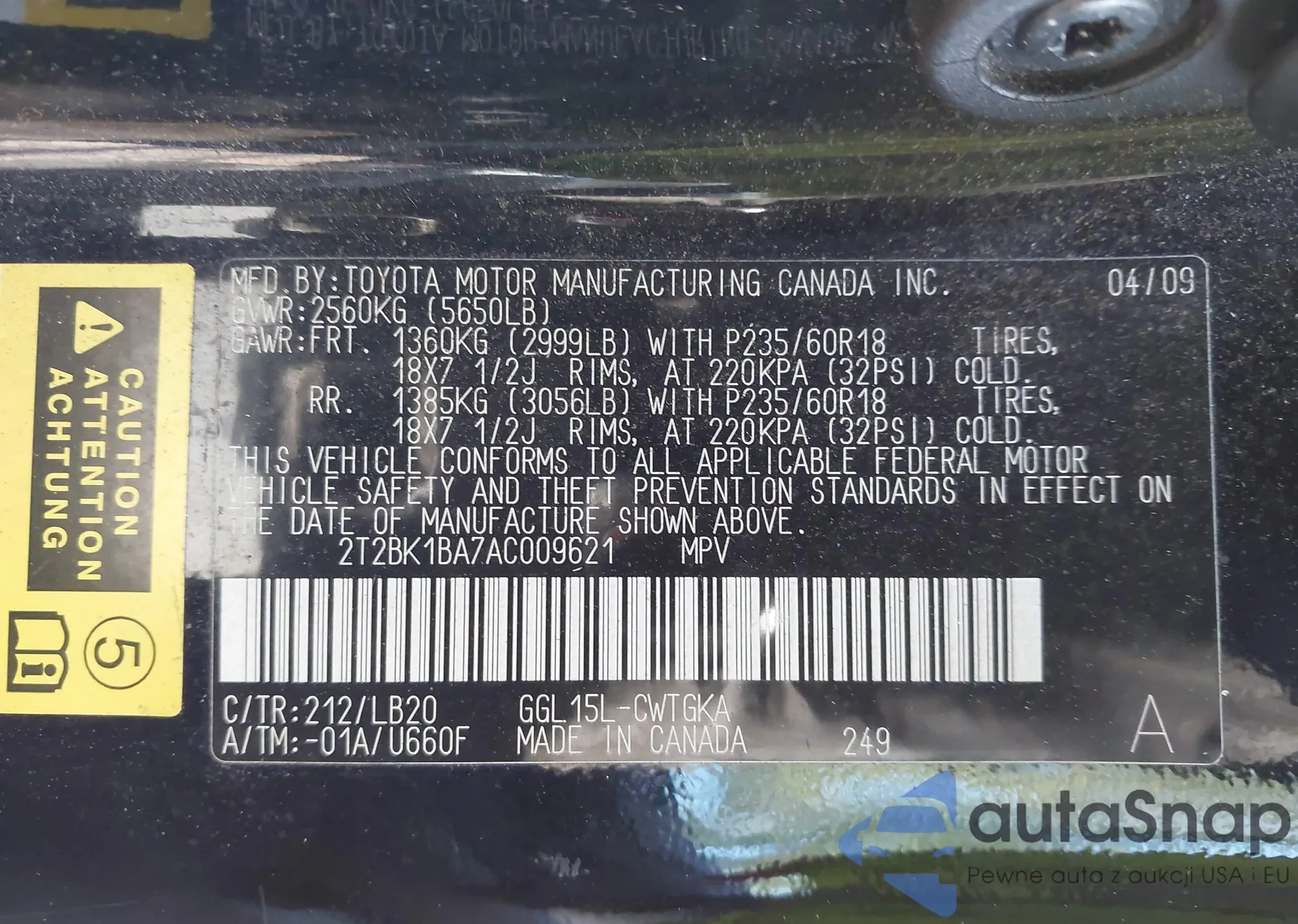 • VIN 2T2BK1BA7AC009621
