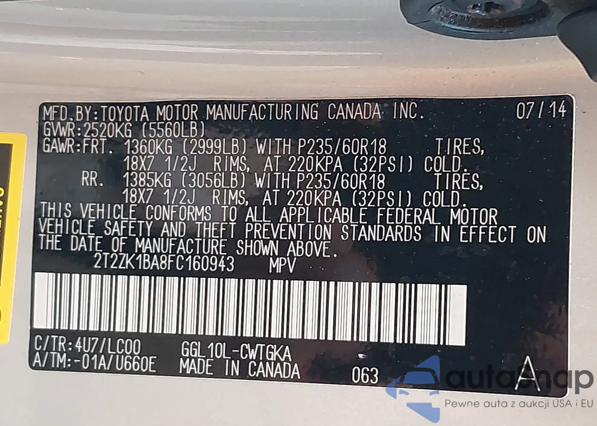 • VIN 2T2ZK1BA8FC160943