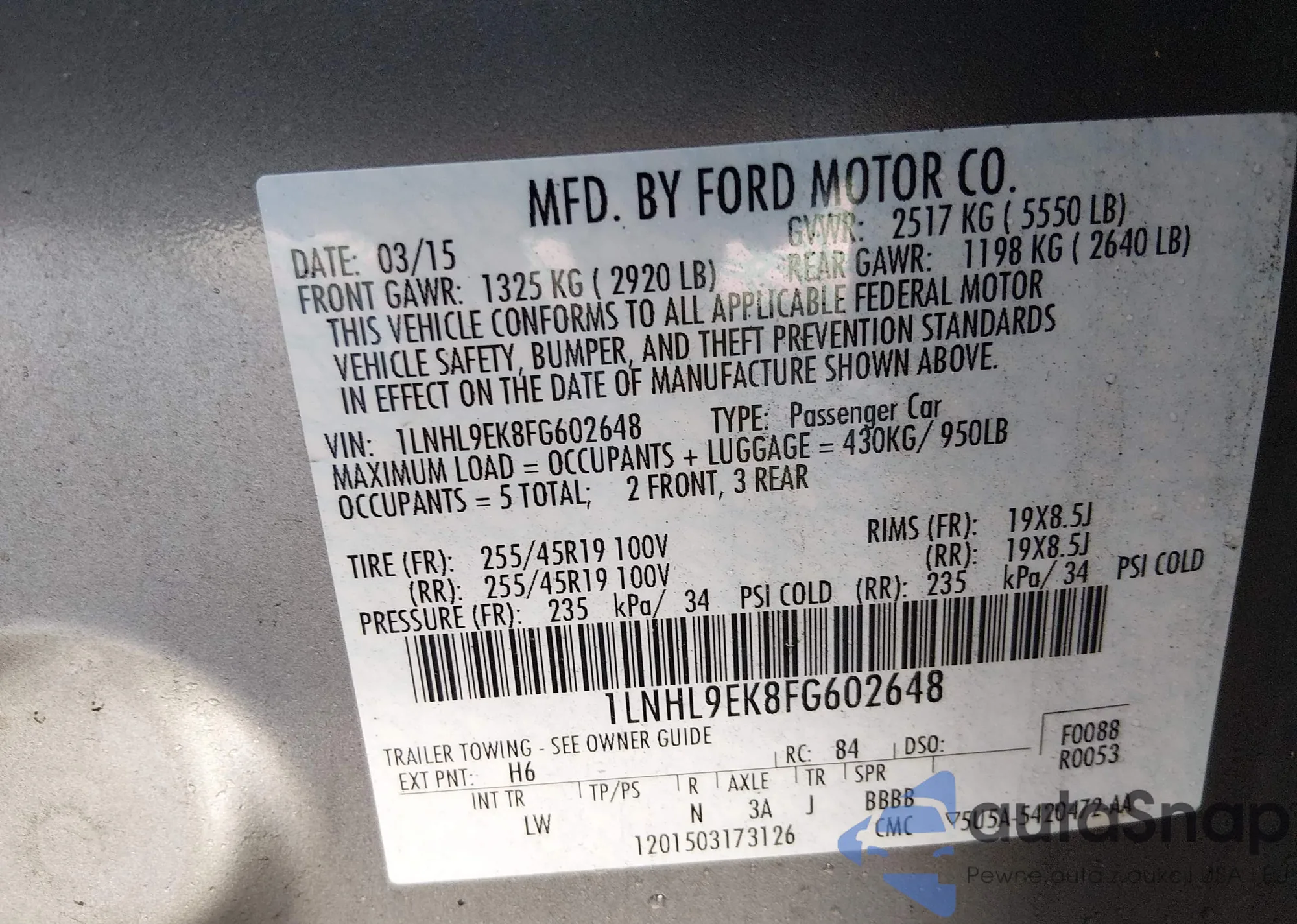 LOT: 44407315 VIN: 1LNHL9EK8FG602648