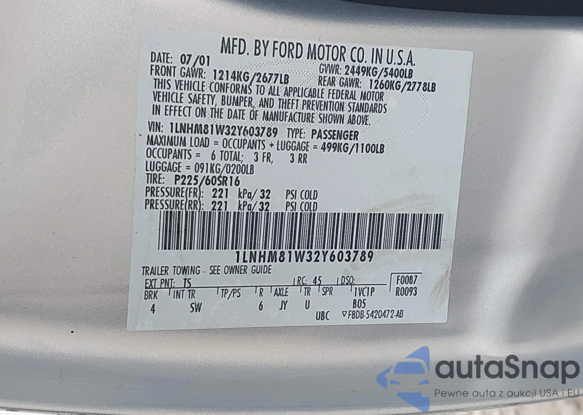 LOT: 44356439 VIN: 1LNHM81W32Y603789