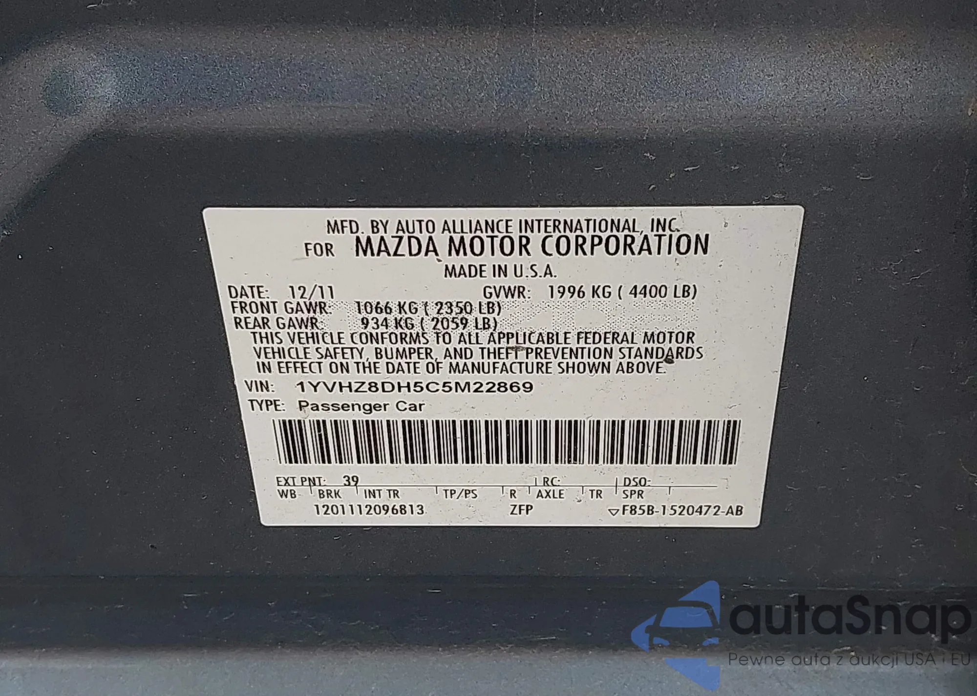 • VIN 1YVHZ8DH5C5M22869