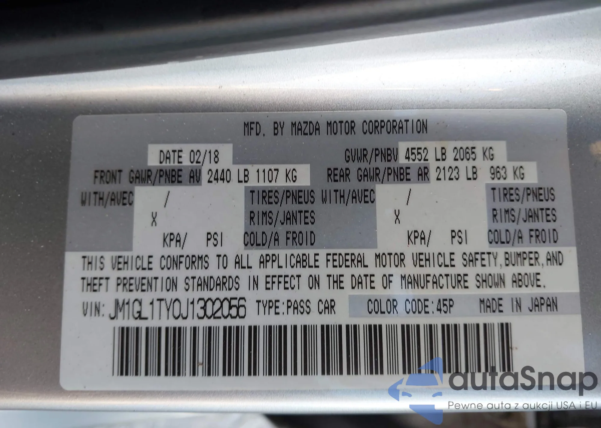 LOT: 43447395 VIN: JM1GL1TY0J1302056