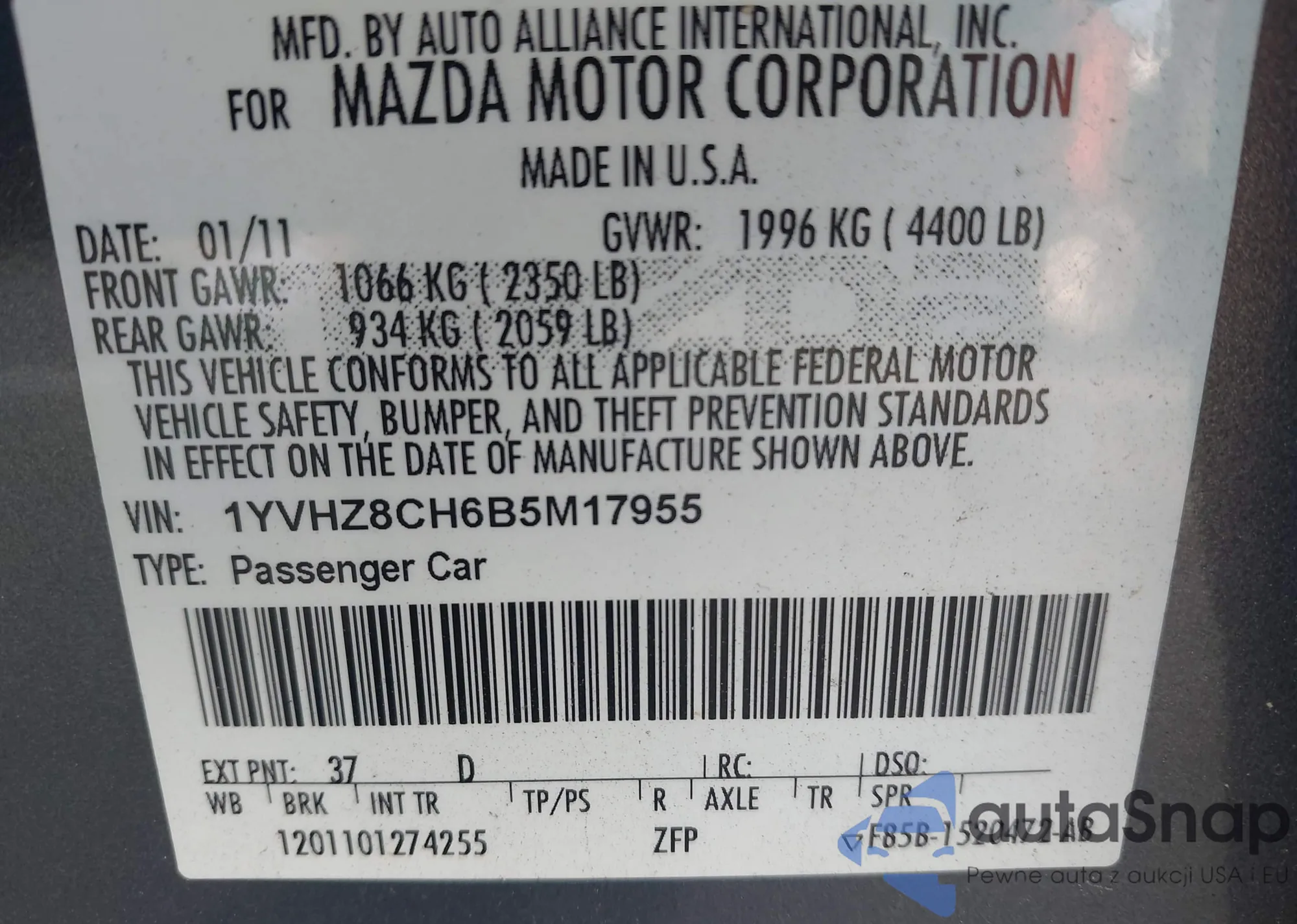 • VIN 1YVHZ8CH6B5M17955