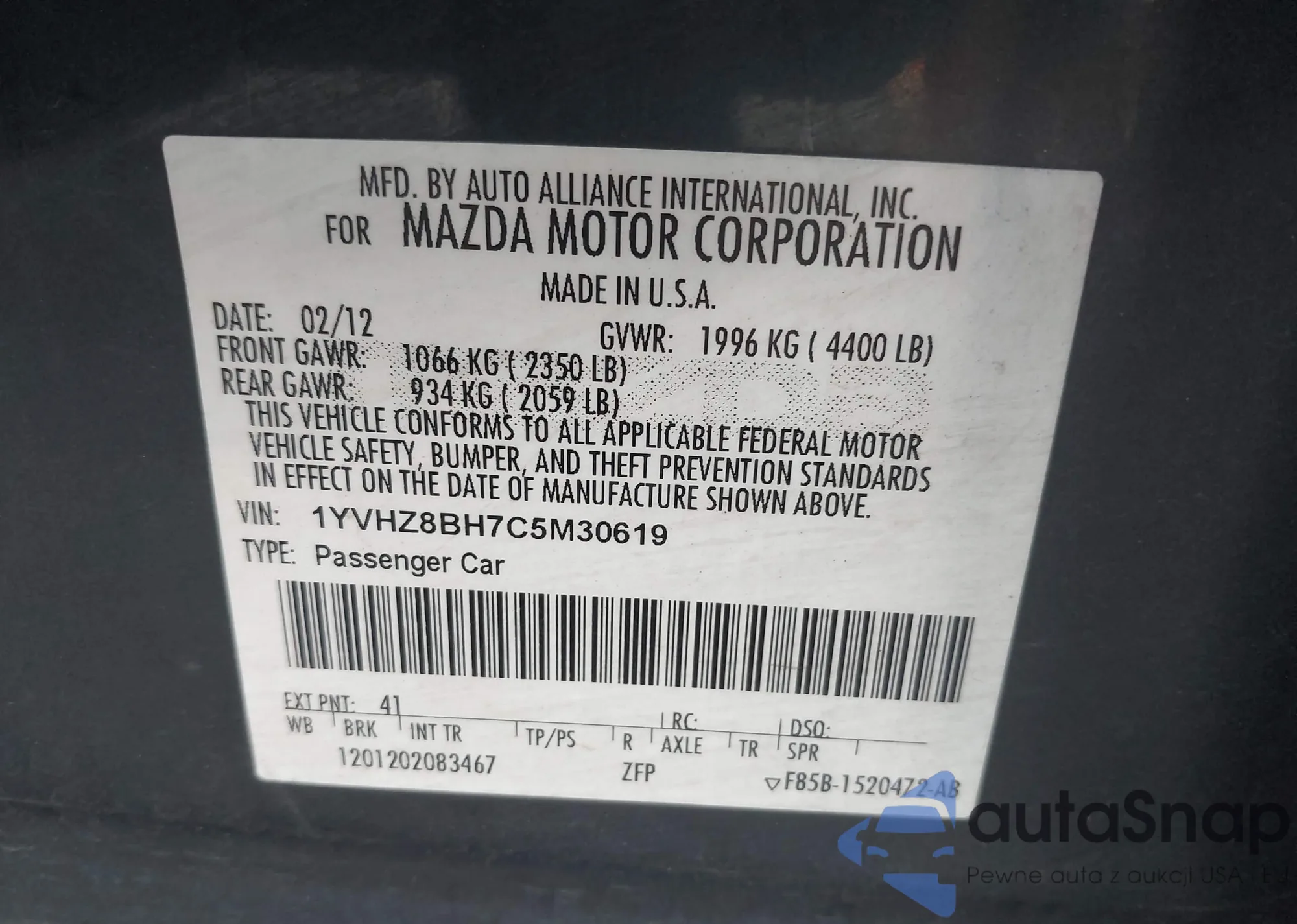 • VIN 1YVHZ8BH7C5M30619