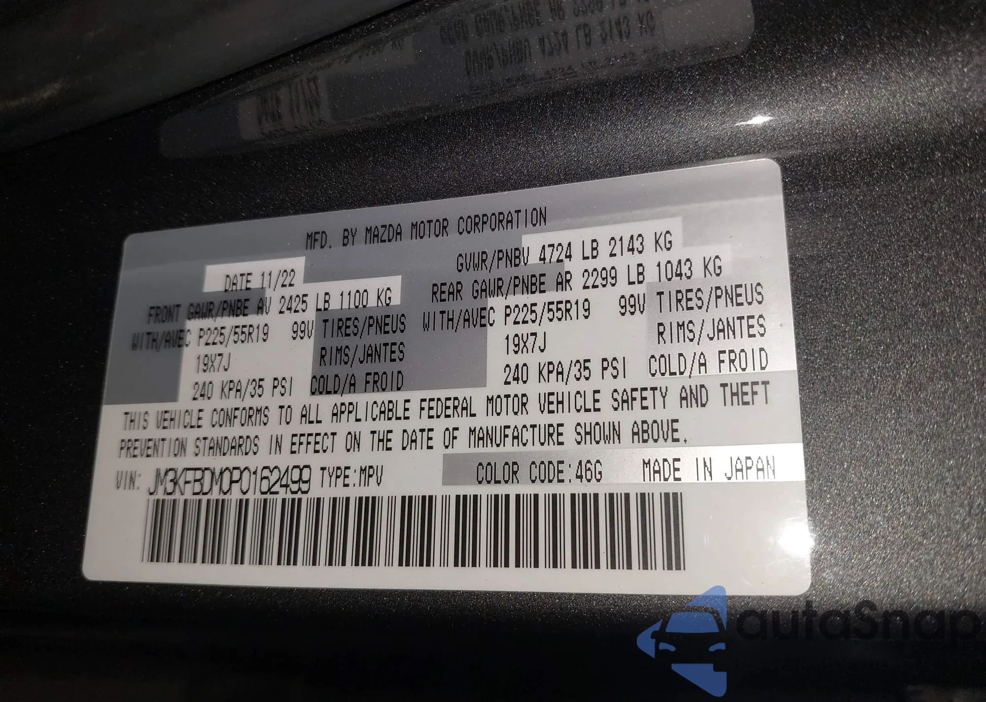 LOT: 44278086 VIN: JM3KFBDM0P0162499