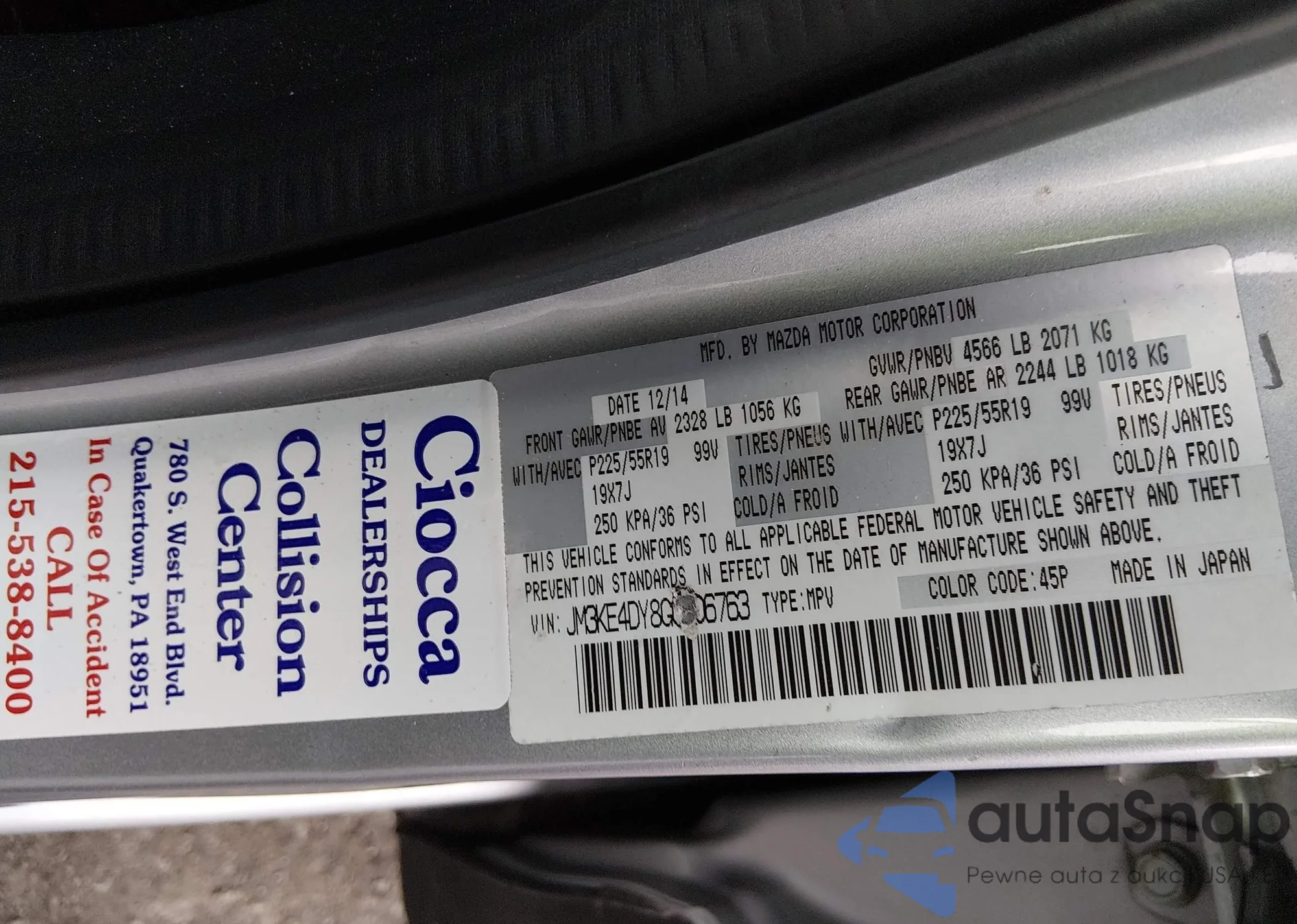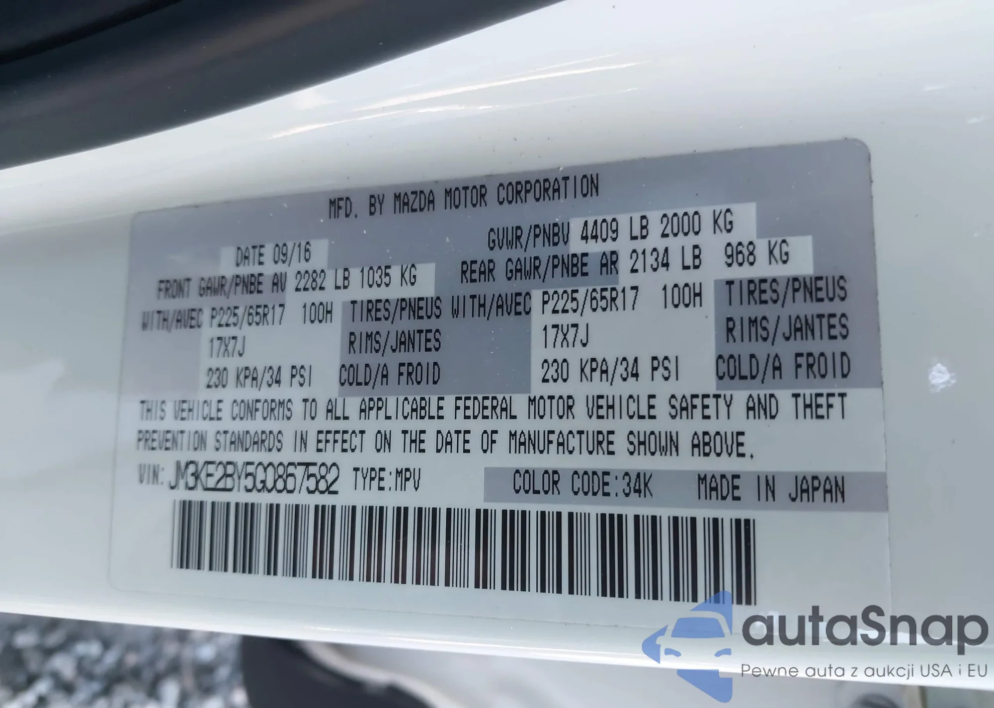 LOT: 44396525 VIN: JM3KE4CY8G0875735