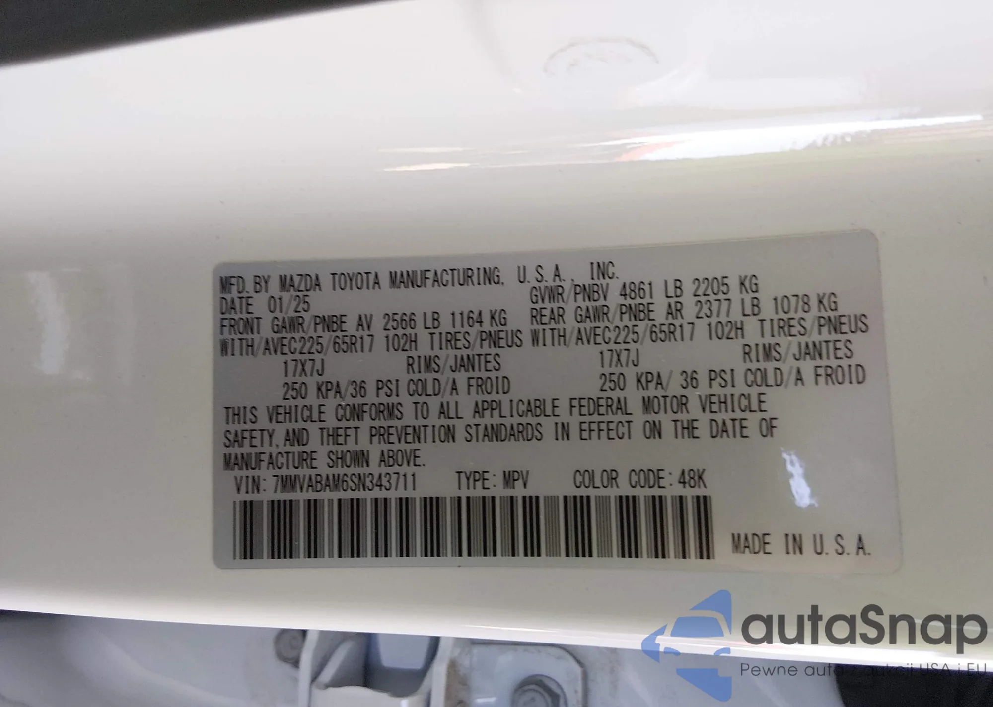 LOT: 44457626 VIN: 7MMVABAM6SN343711