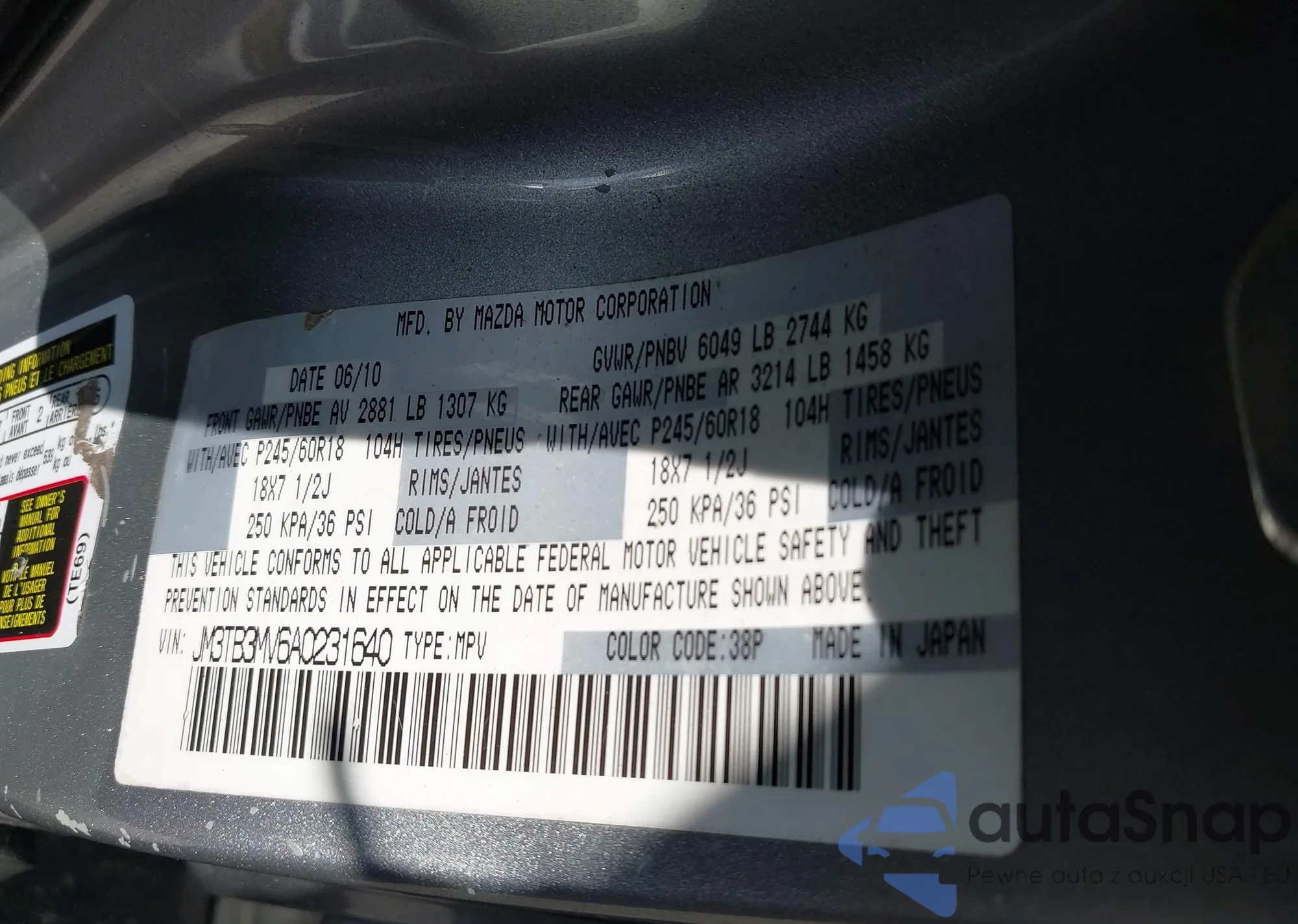 • VIN JM3TB3MV6A0231640