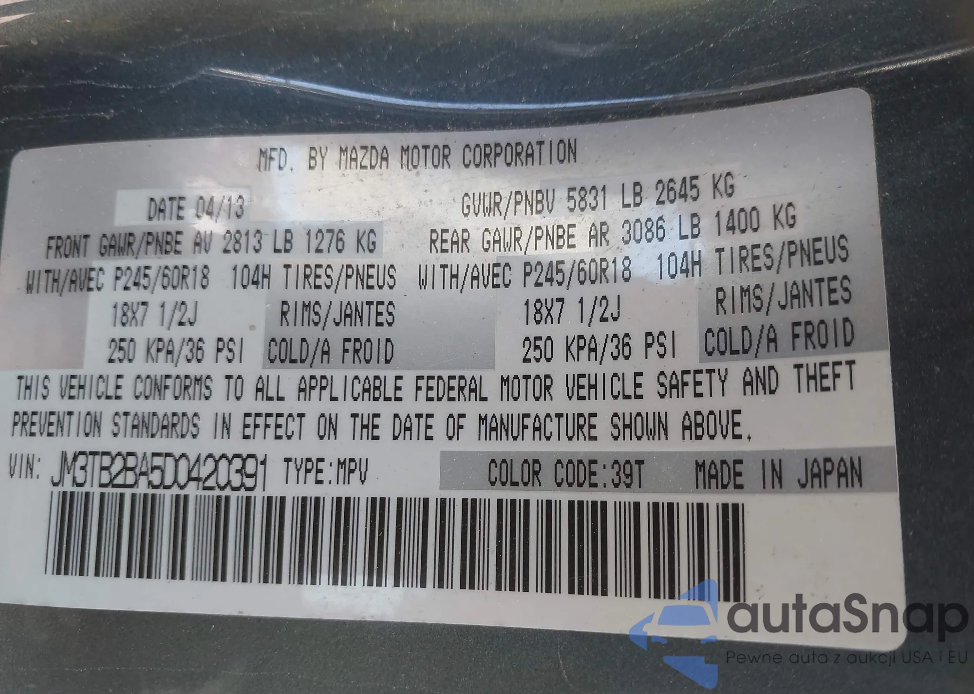 LOT: 44239625 VIN: JM3TB2BA5D0420391