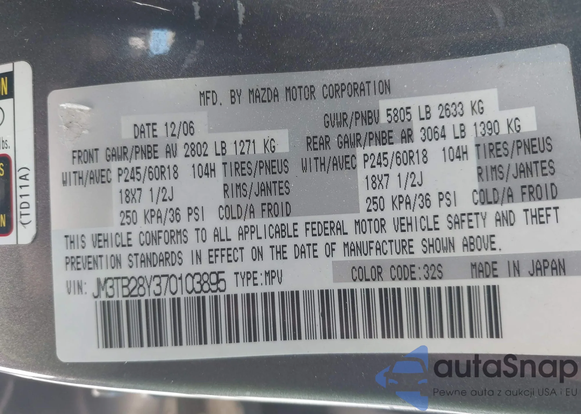 • VIN JM3TB28Y370103895