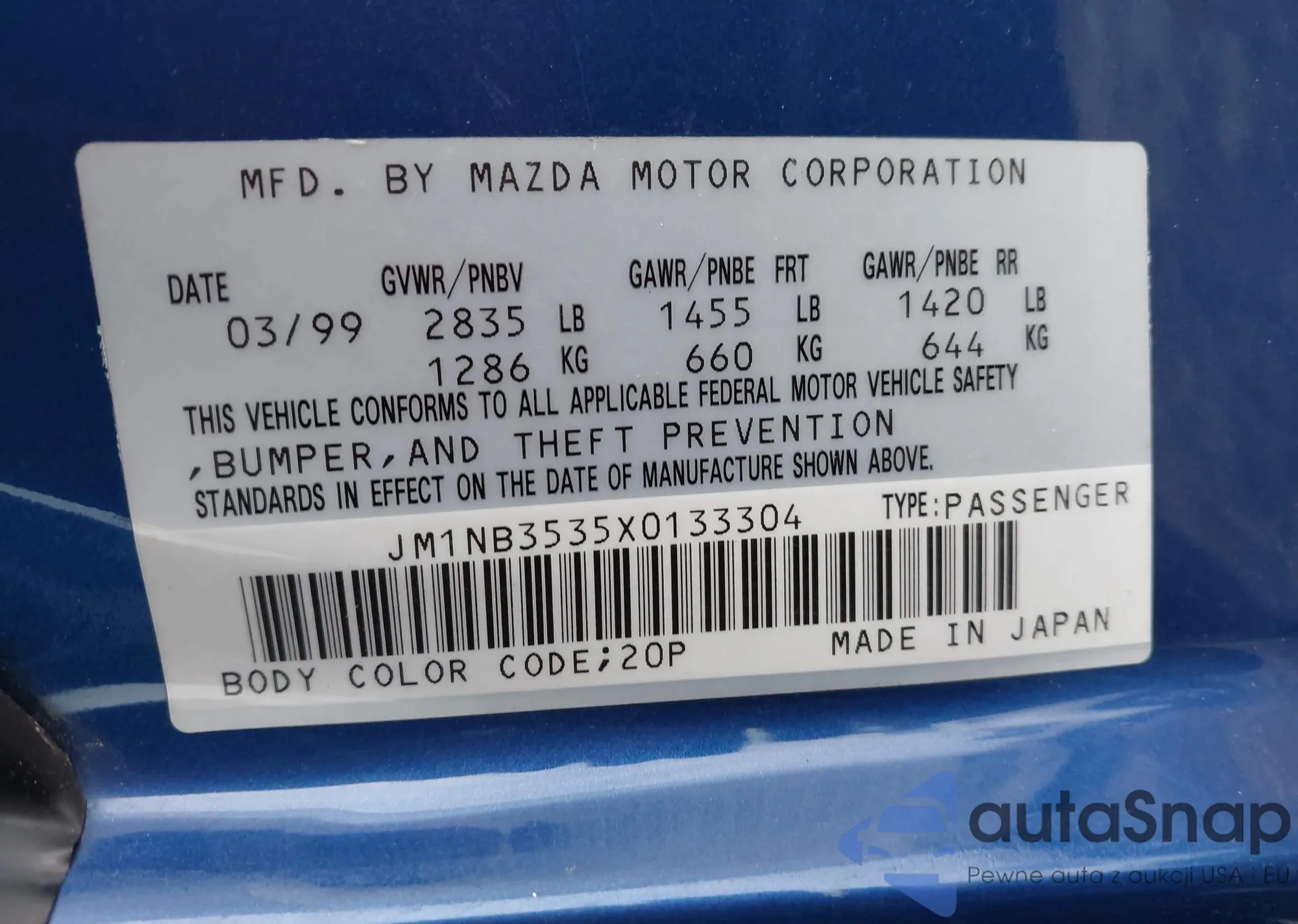 LOT: 44483367 VIN: JM1NB3535X0133304