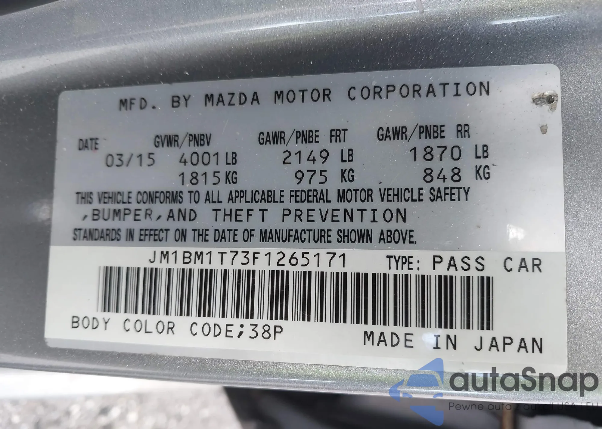LOT: 44389236 VIN: JM1BM1T73F1265171