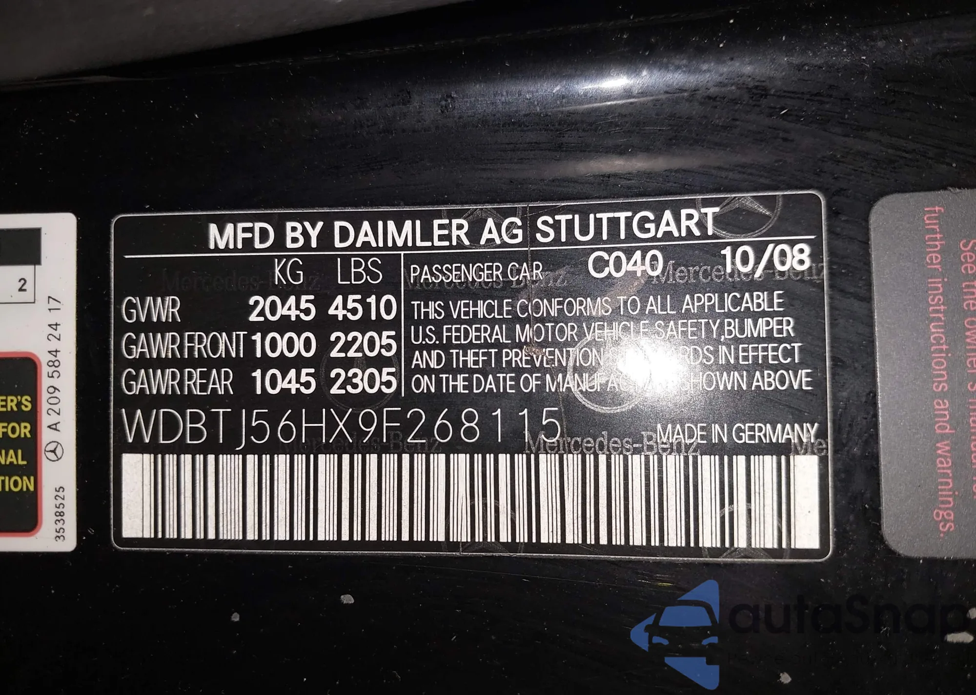 • VIN WDBTJ56HX9F268115
