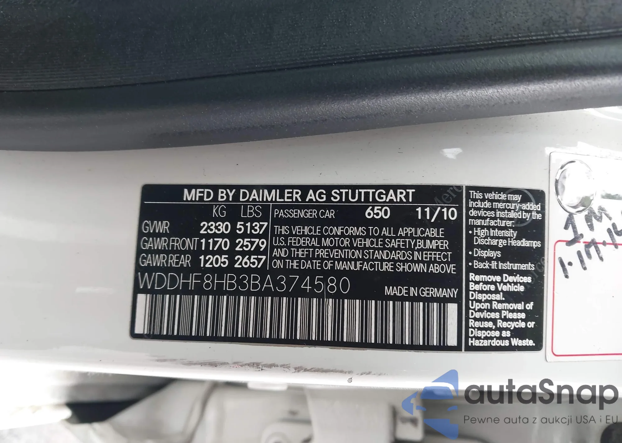 • VIN WDDHF8HB3BA374580
