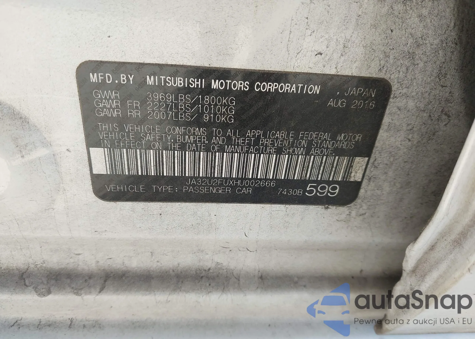 LOT: 43801515 VIN: JA32U2FU4HU002498