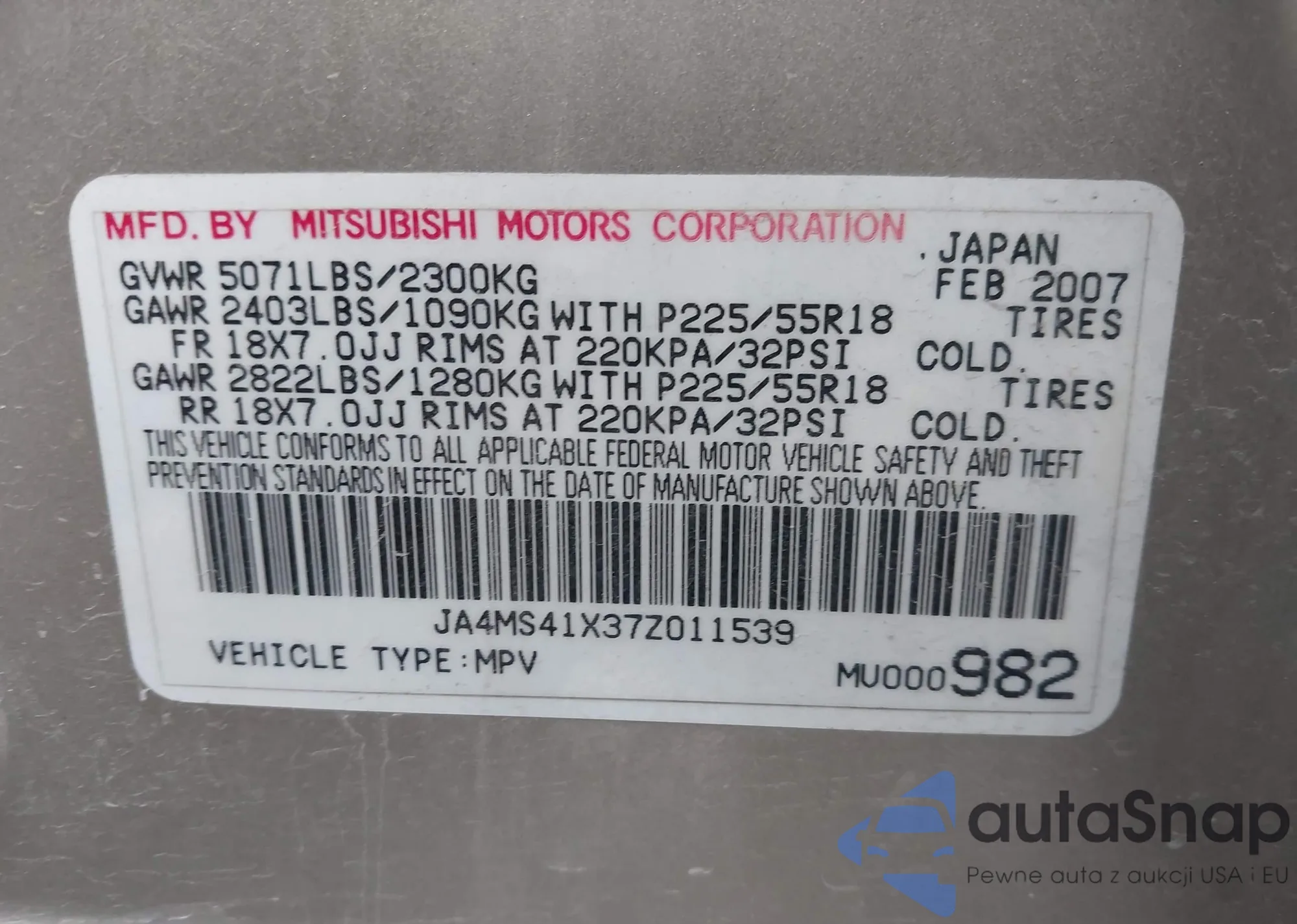 • VIN JA4MS41X37Z011539