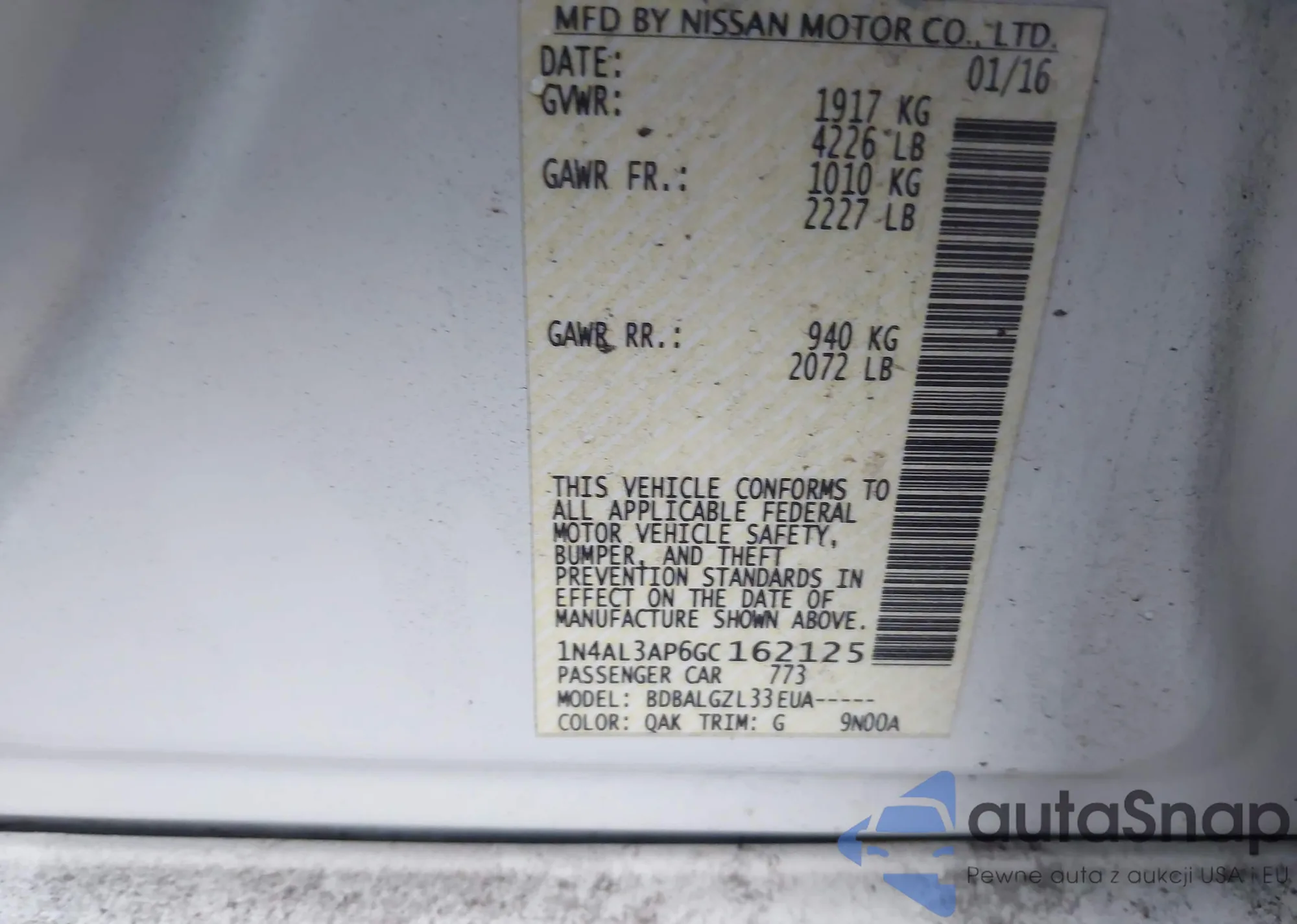 LOT: 44334743 VIN: 1N4AL3AP6GC162125