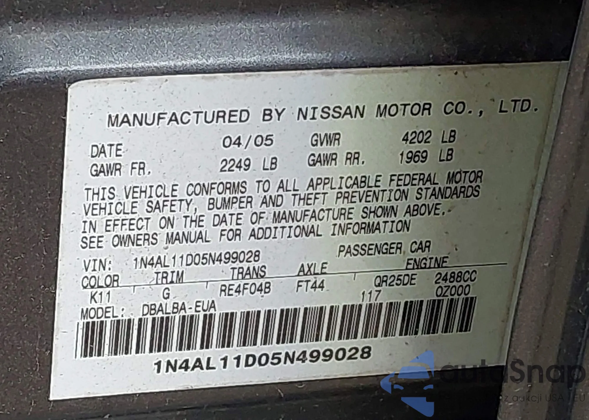 • VIN 1N4AL11D05N499028