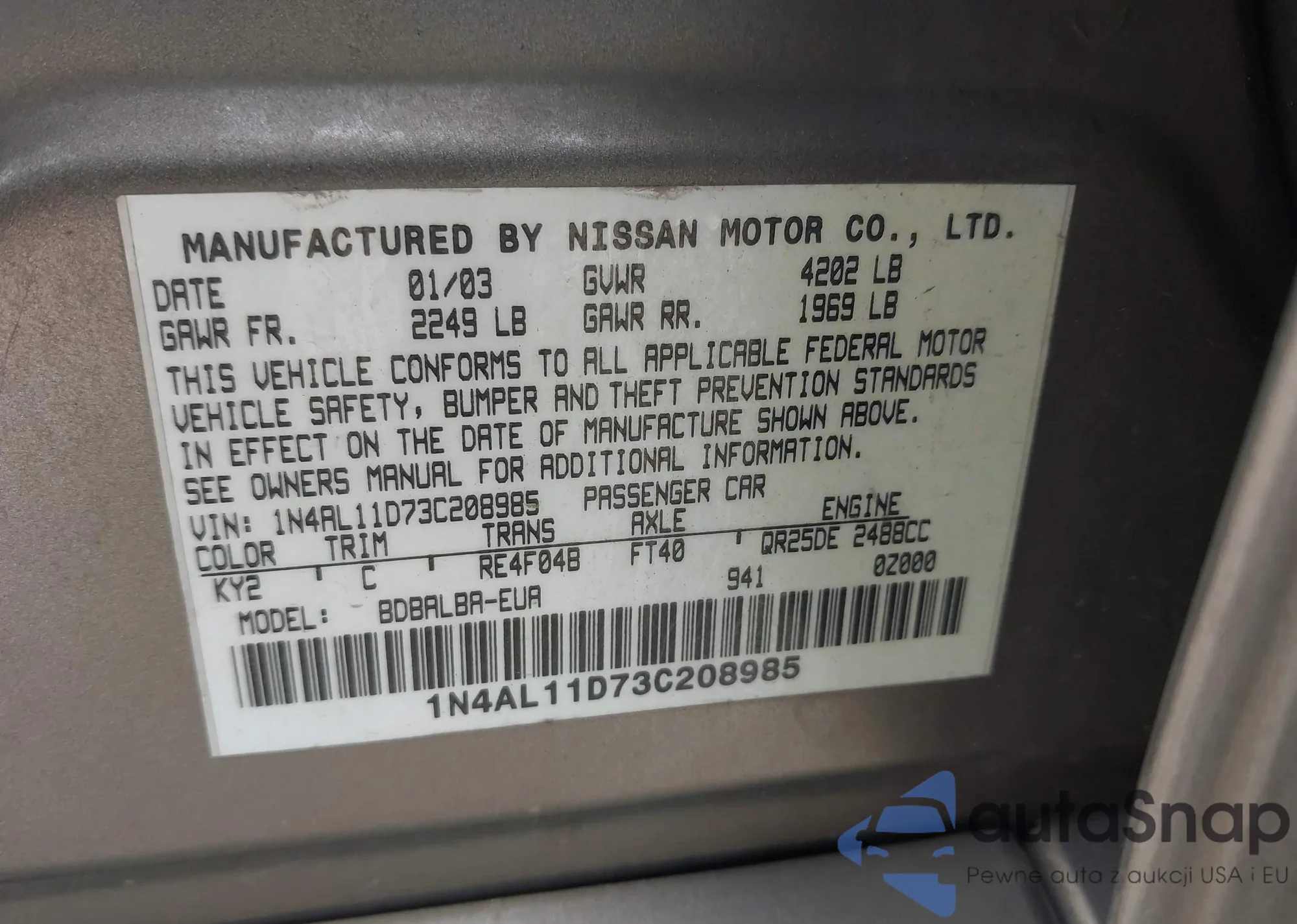2003 Nissan Altima 2.5 S z USA, uszkodzony, nr VIN 1N4AL11D73C208985