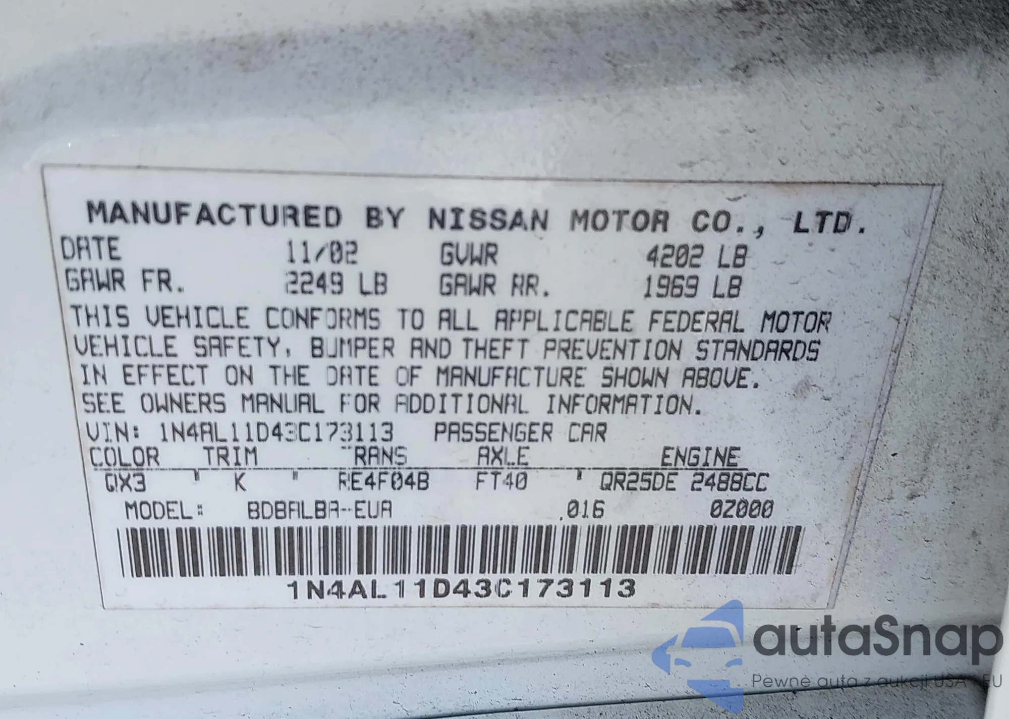 • VIN 1N4AL11D43C173113