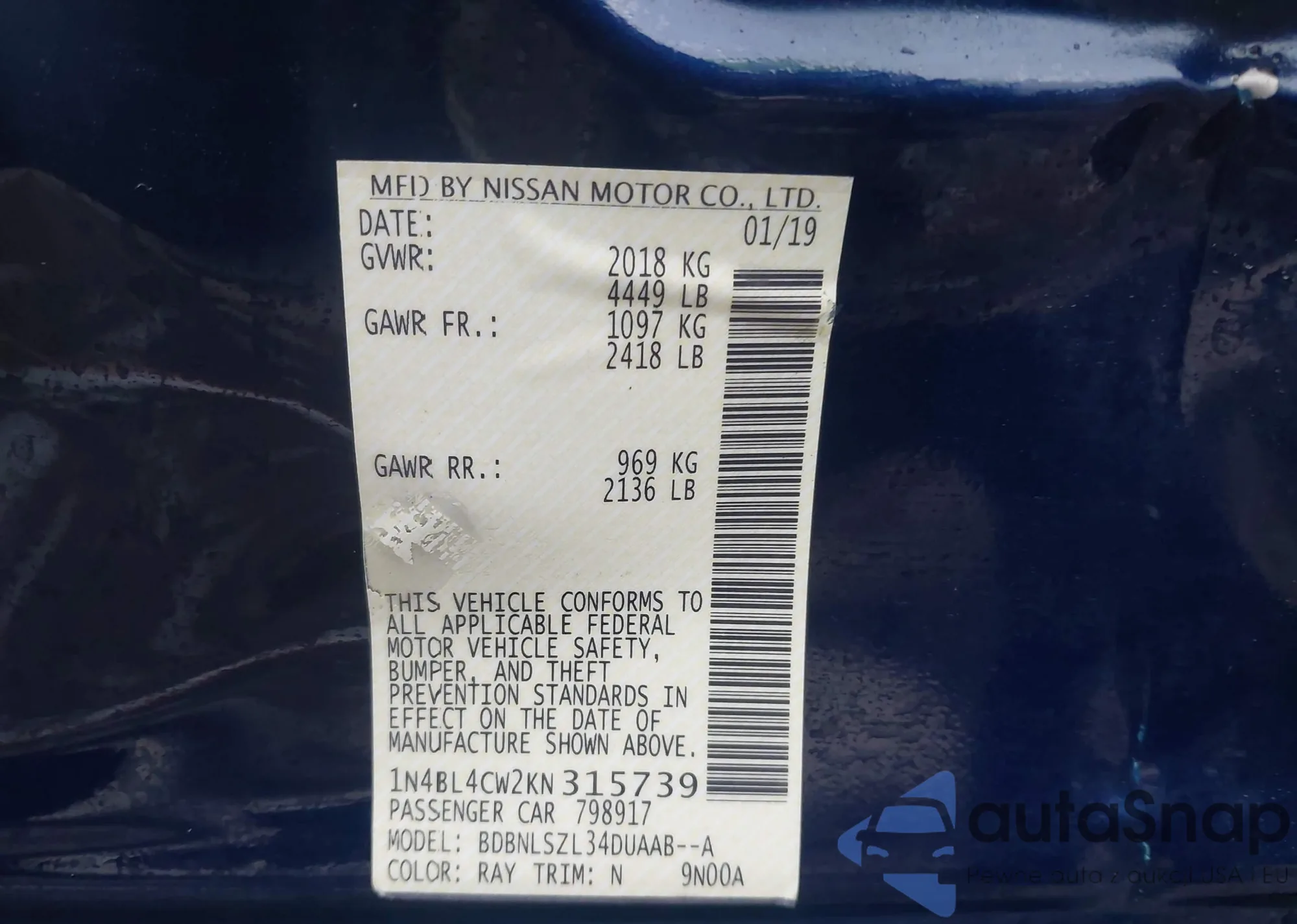 • VIN 1N4BL4CW2KN315739