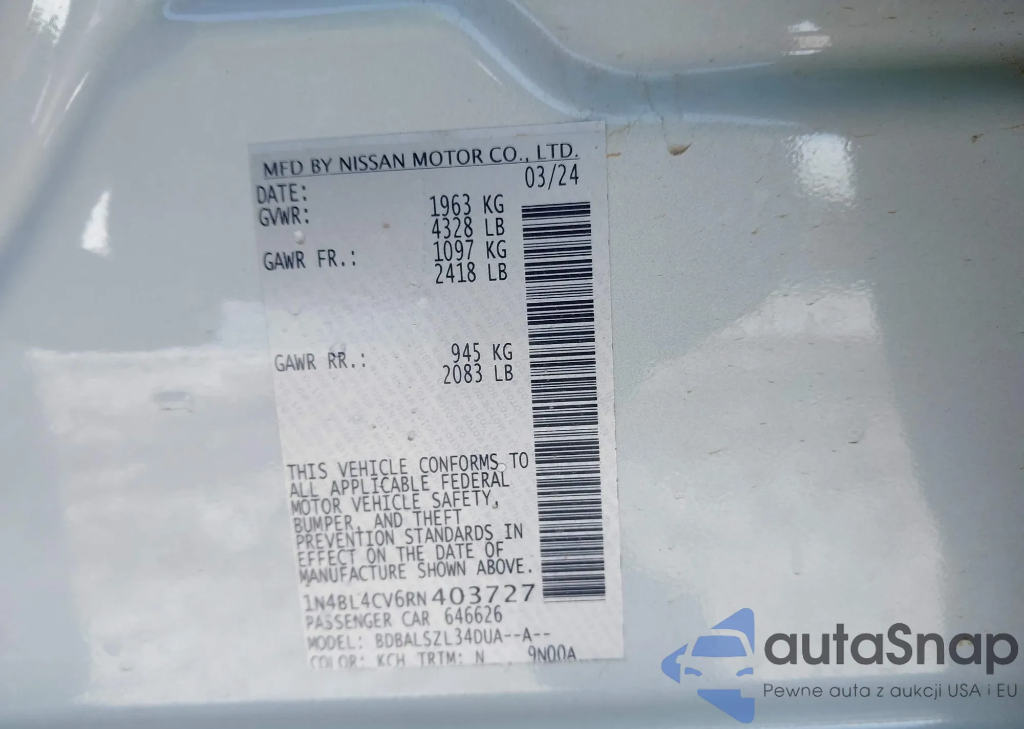 LOT: 44220155 VIN: 1N4BL4CV6RN403727