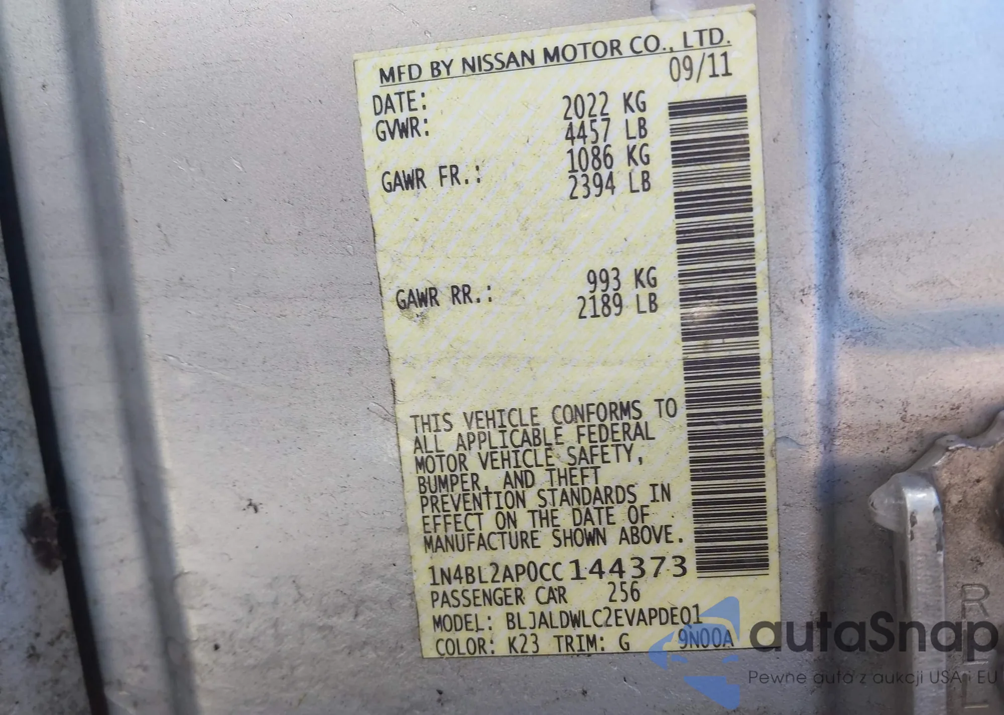 LOT: 44276082 VIN: 1N4BL2AP0CC144373
