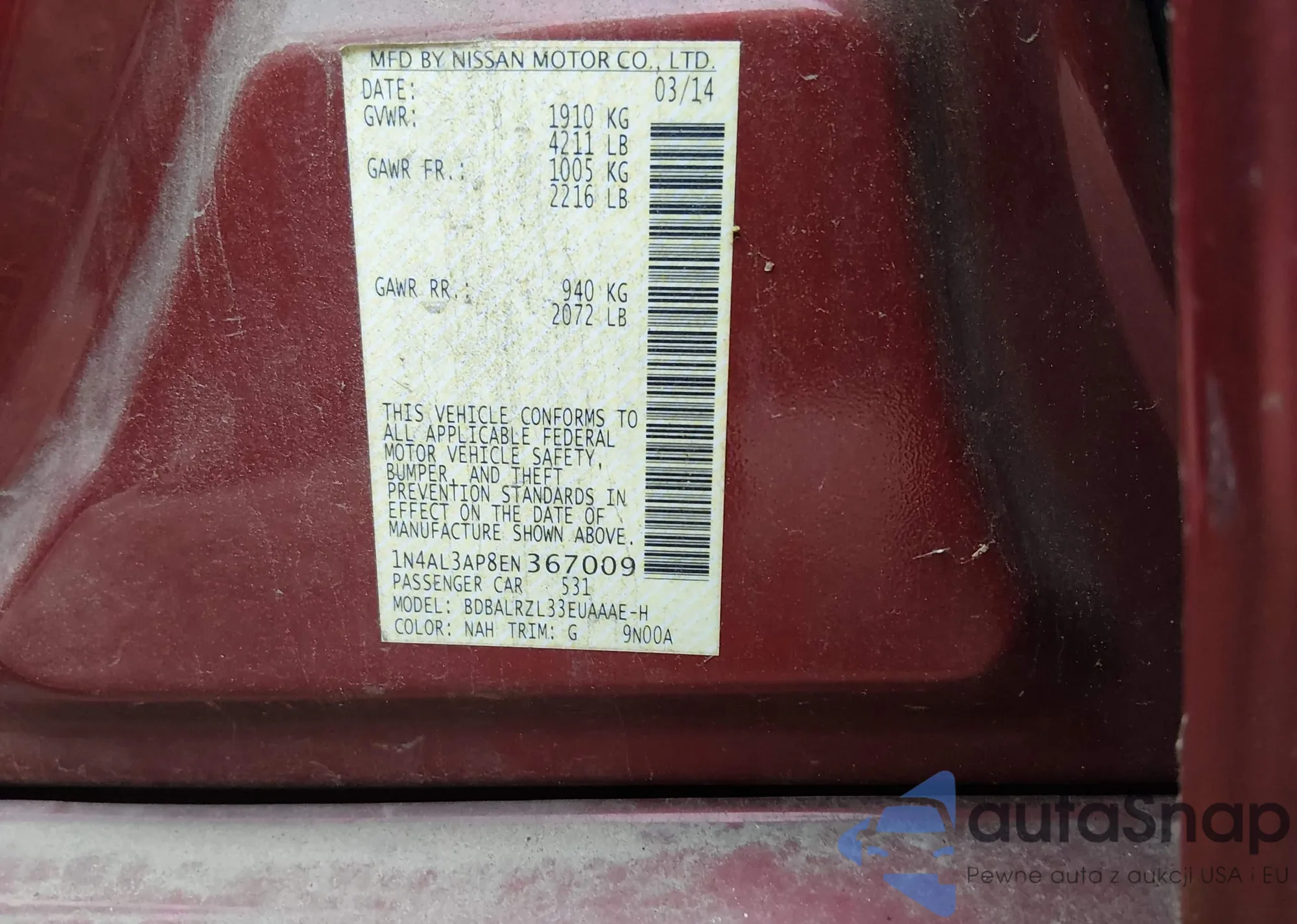 LOT: 44455381 VIN: 1N4AL3AP8EN367009