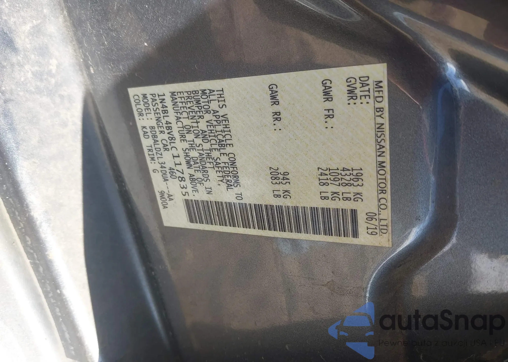 • VIN 1N4BL4BV8LC117835