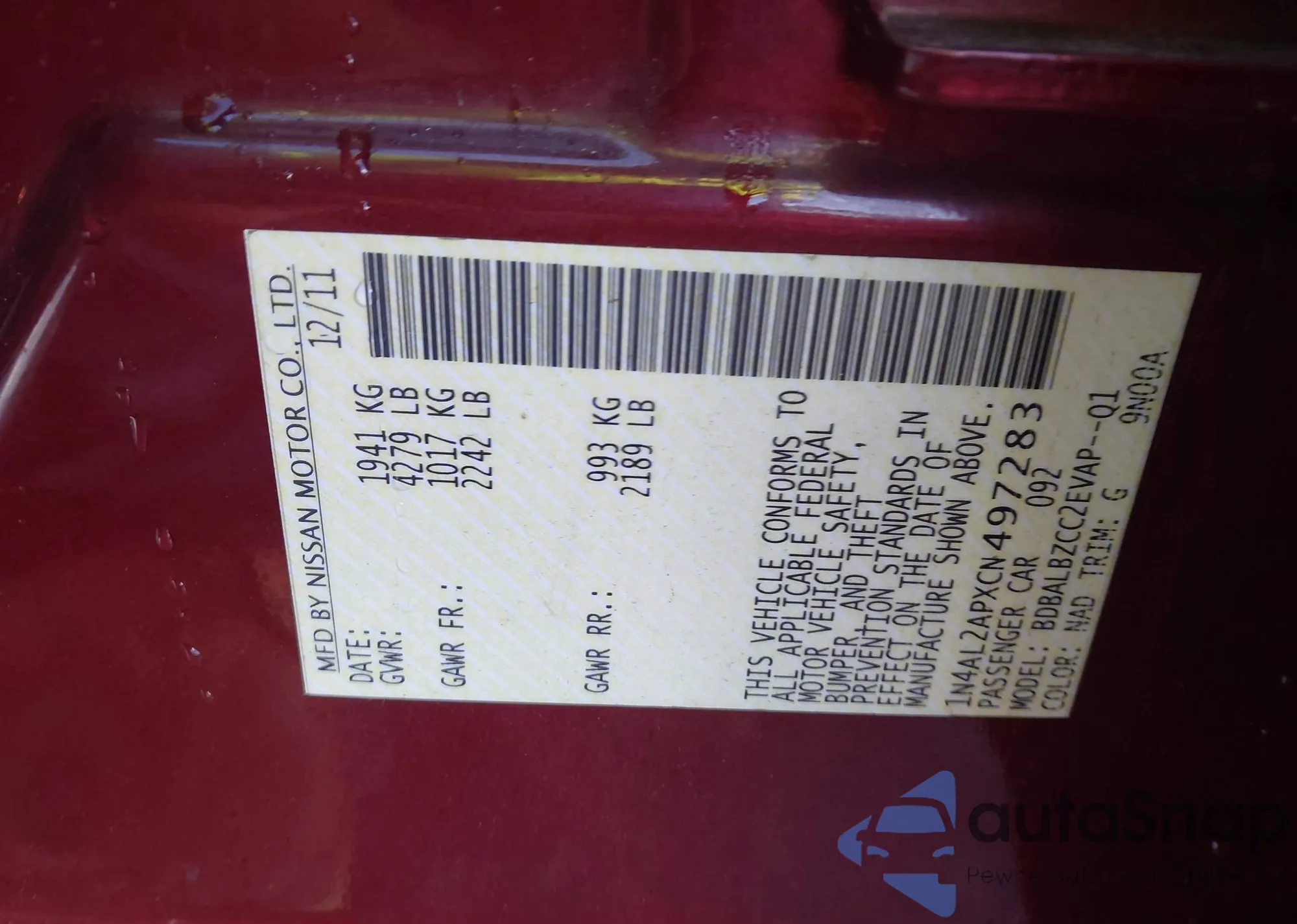 LOT: 44380458 VIN: 1N4AL2APXCN497283