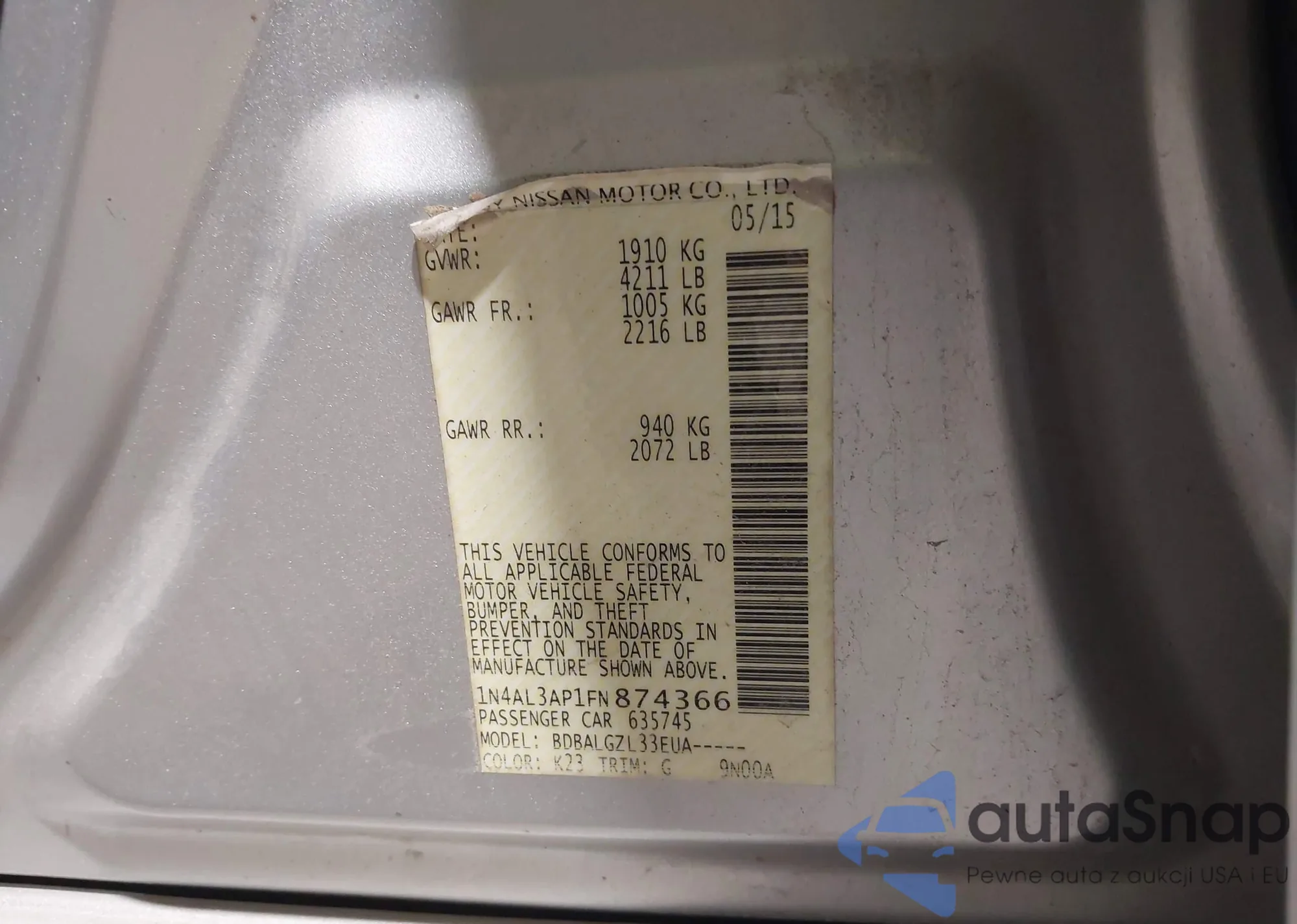 LOT: 44174972 VIN: 1N4AL3AP1FN874366