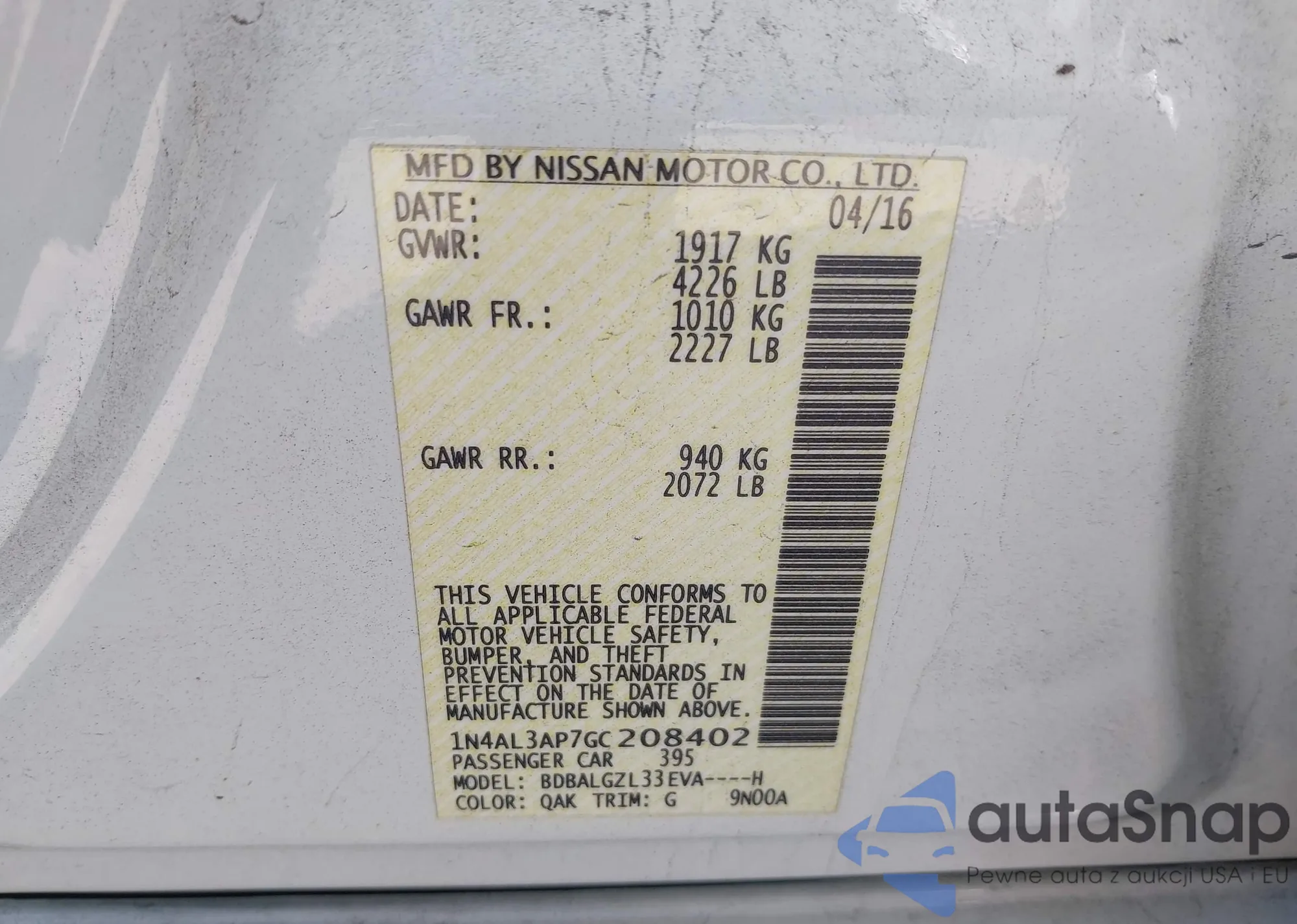 • VIN 1N4AL3AP7GC208402