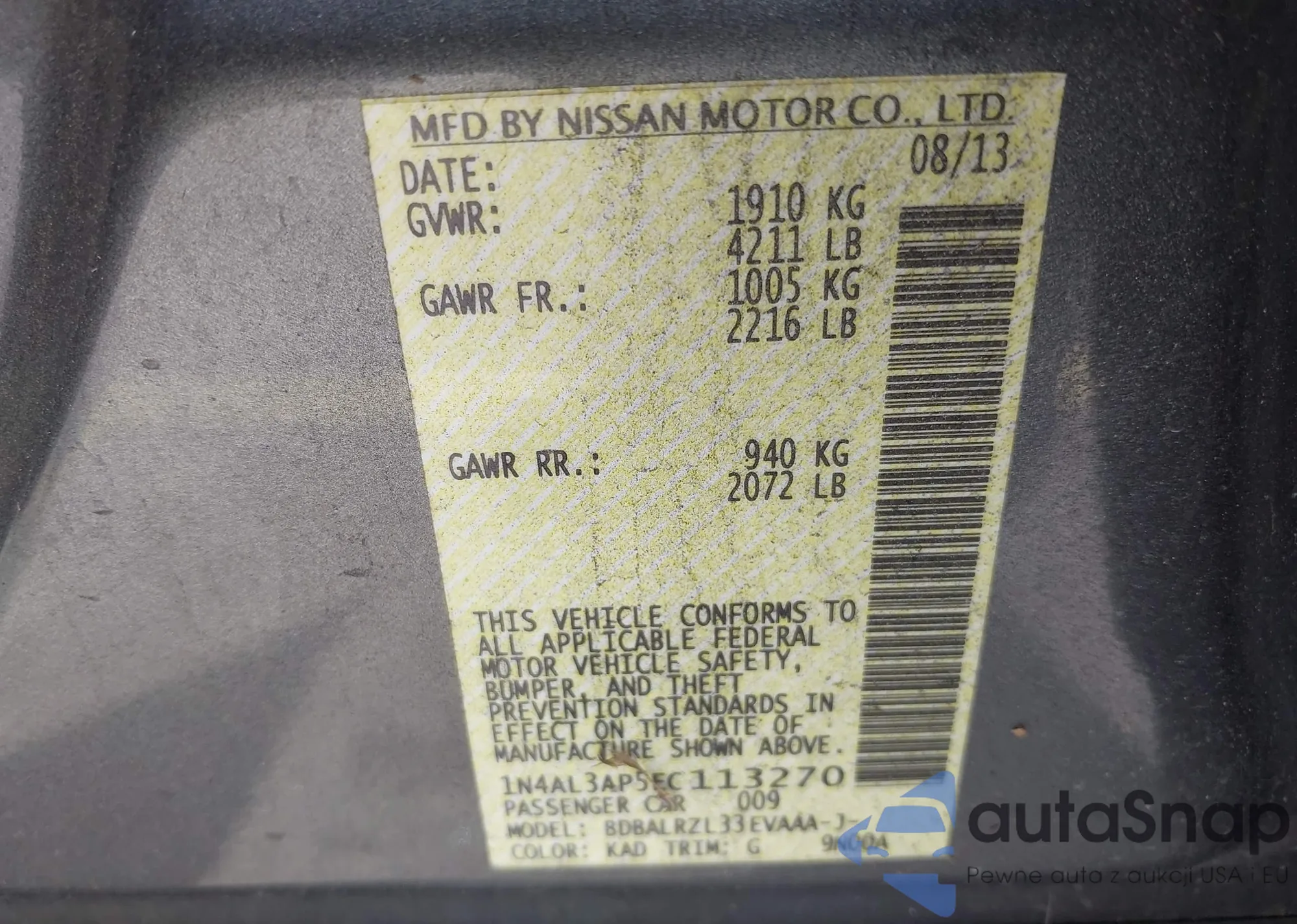 LOT: 44239002 VIN: 1N4AL3AP5EC113270