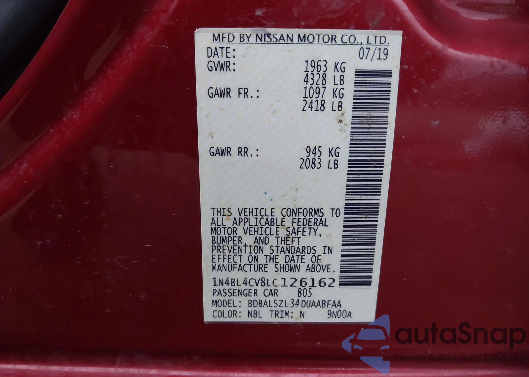 • VIN 1N4BL4CV7LC187454