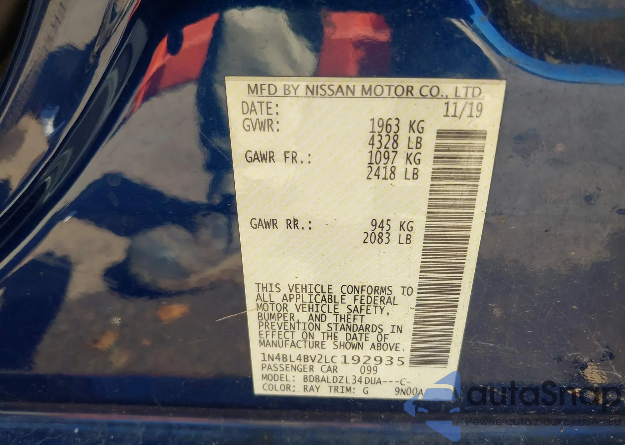 • VIN 1N4BL4BV2LC192935