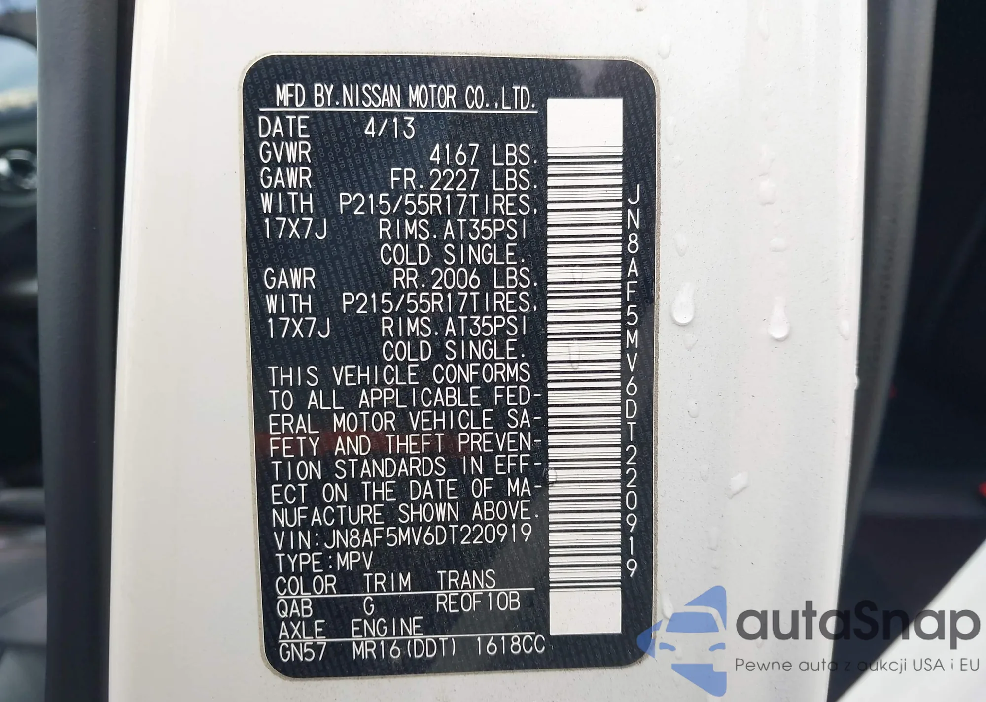 LOT: 44454225 VIN: JN8AF5MR5DT216346