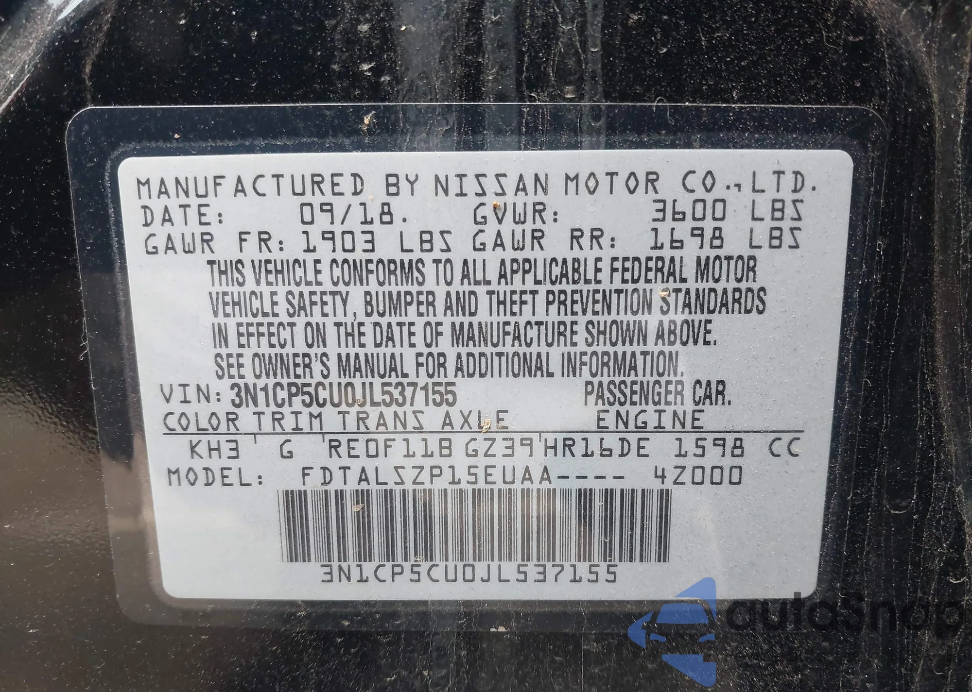 • VIN 3N1CP5CU0JL537155