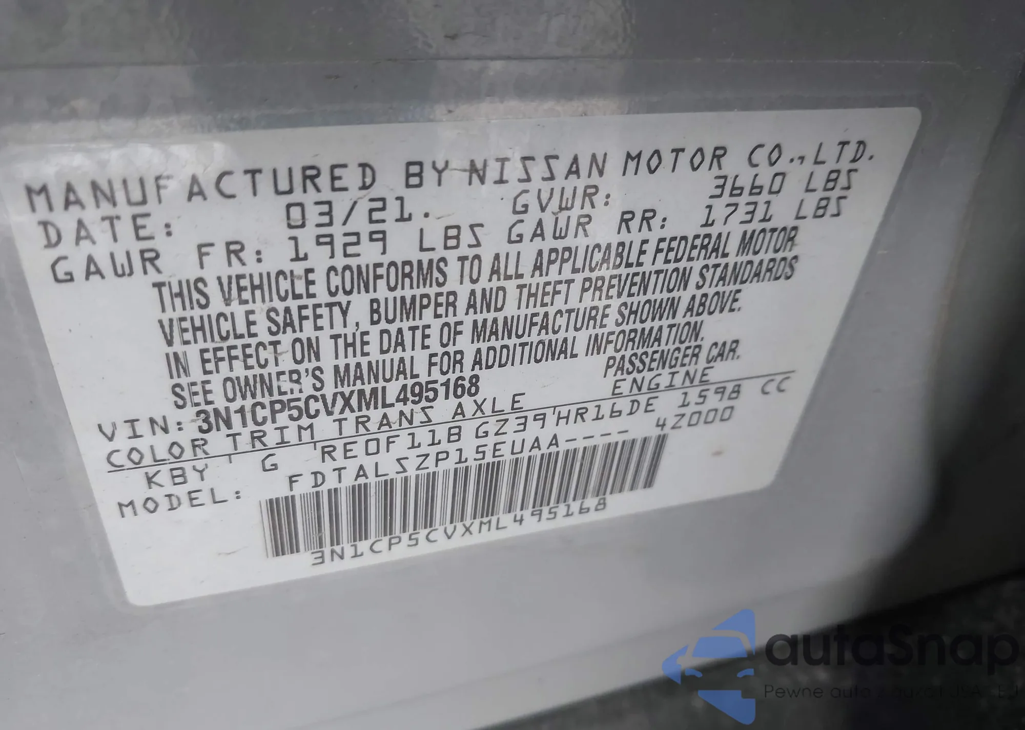 LOT: 44049572 VIN: 3N1CP5CVXML495168