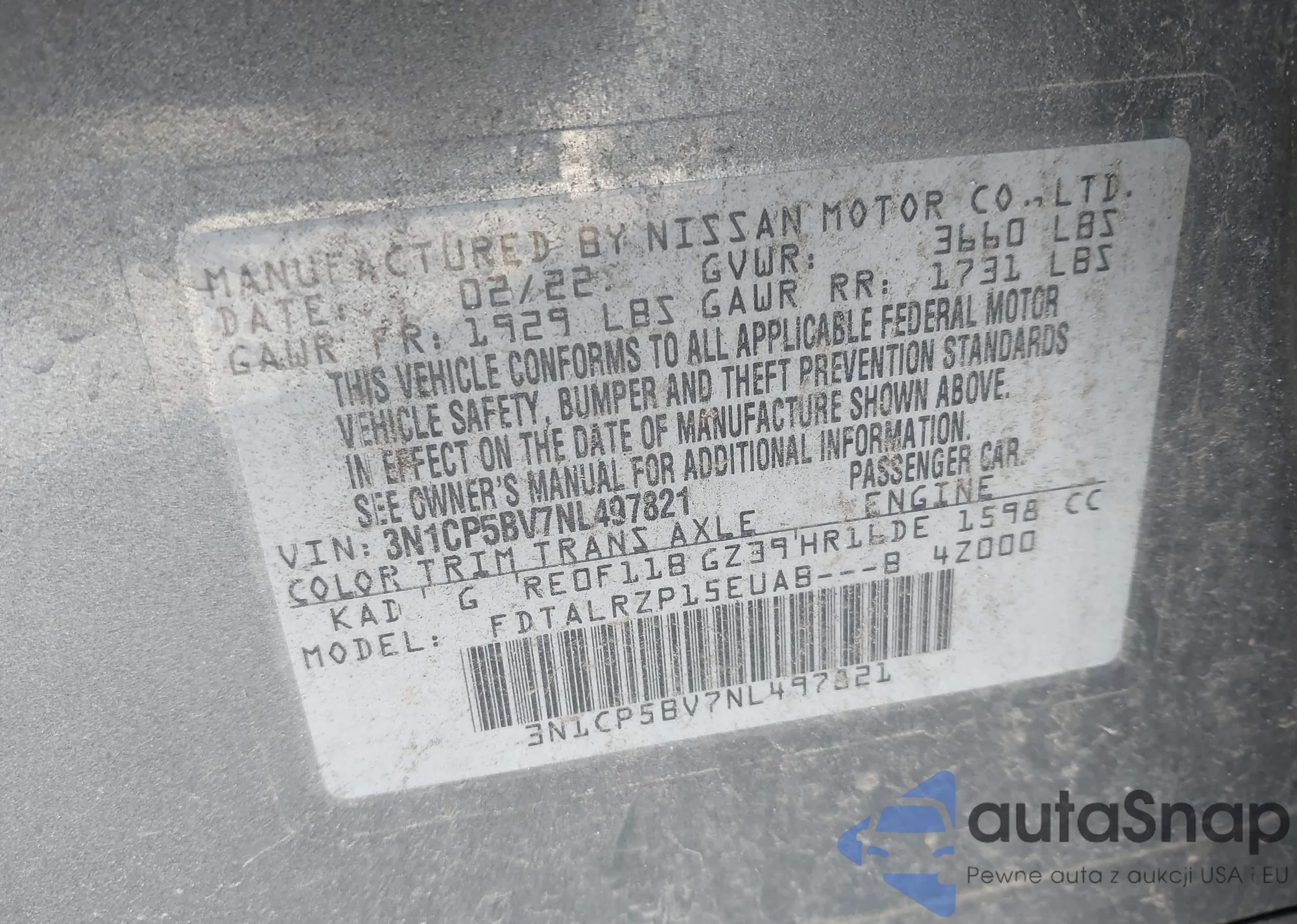 LOT: 44234504 VIN: 3N1CP5BV7NL497821