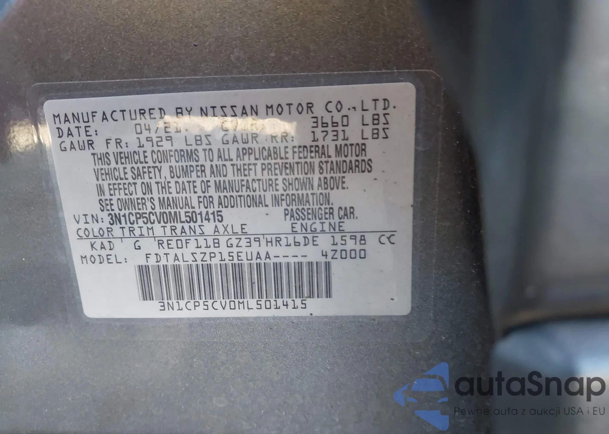 LOT: 43869227 VIN: 3N1CP5CV0ML501415