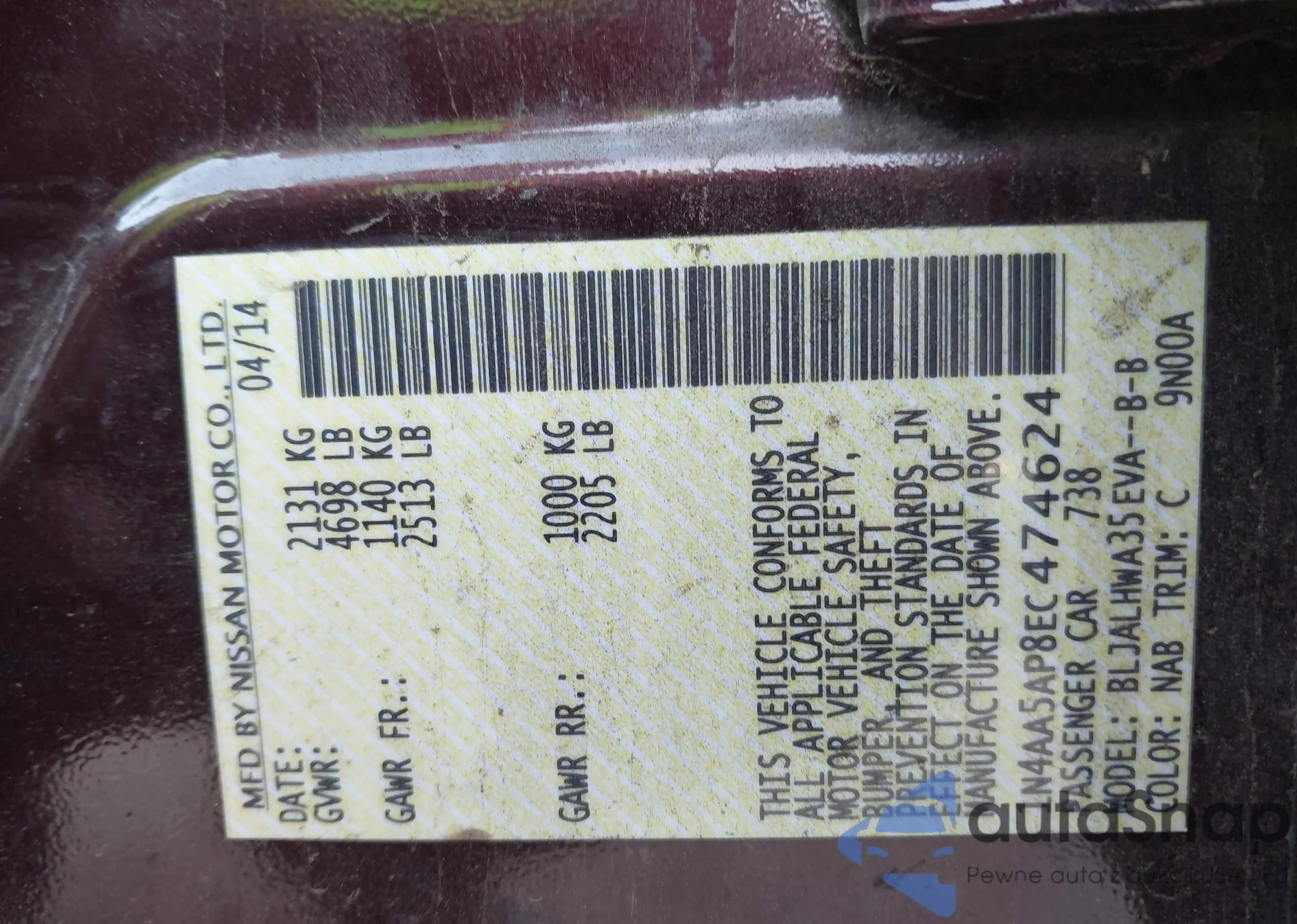 LOT: 43937332 VIN: 1N4AA5AP8EC474624
