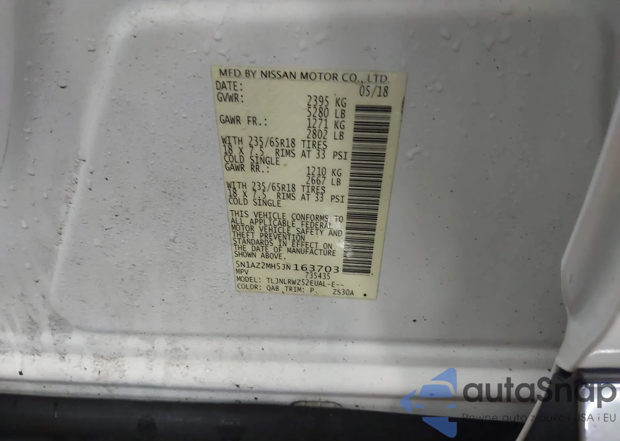 LOT: 44318862 VIN: 5N1AZ2MH5JN163703